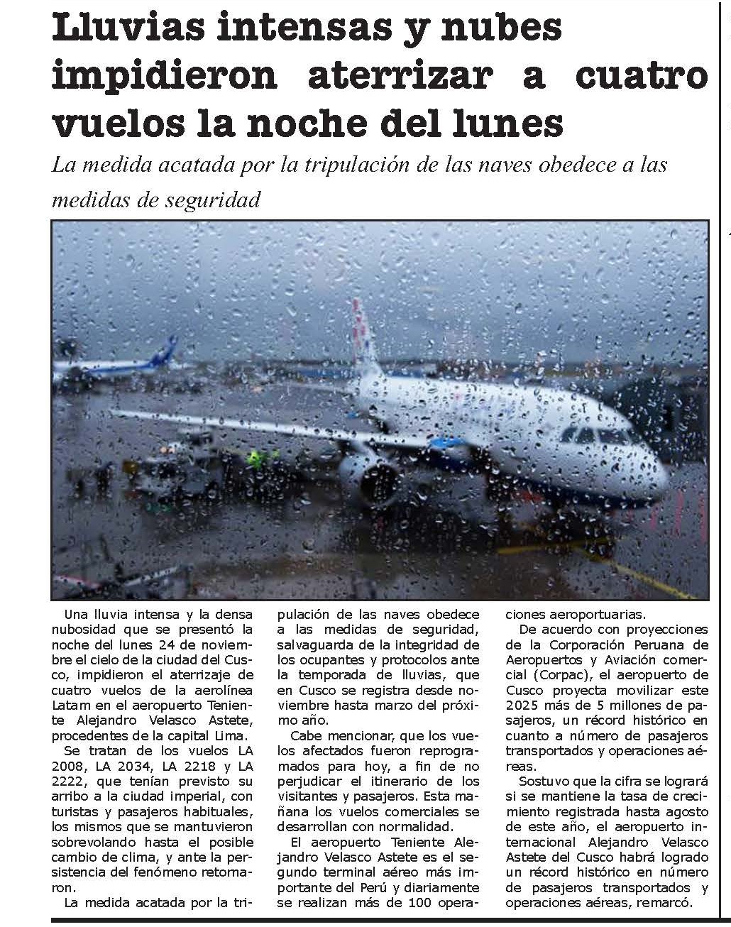 Una lluvia intensa y la densa nubosidad que se presentó la noche del lunes 24 de noviembre el cielo de la ciudad del Cusco, impidieron el aterrizaje de cuatro vuelos de la aerolínea Latam en el aeropuerto Teniente Alejandro Velasco Astete, procedentes de la capital de Lima.