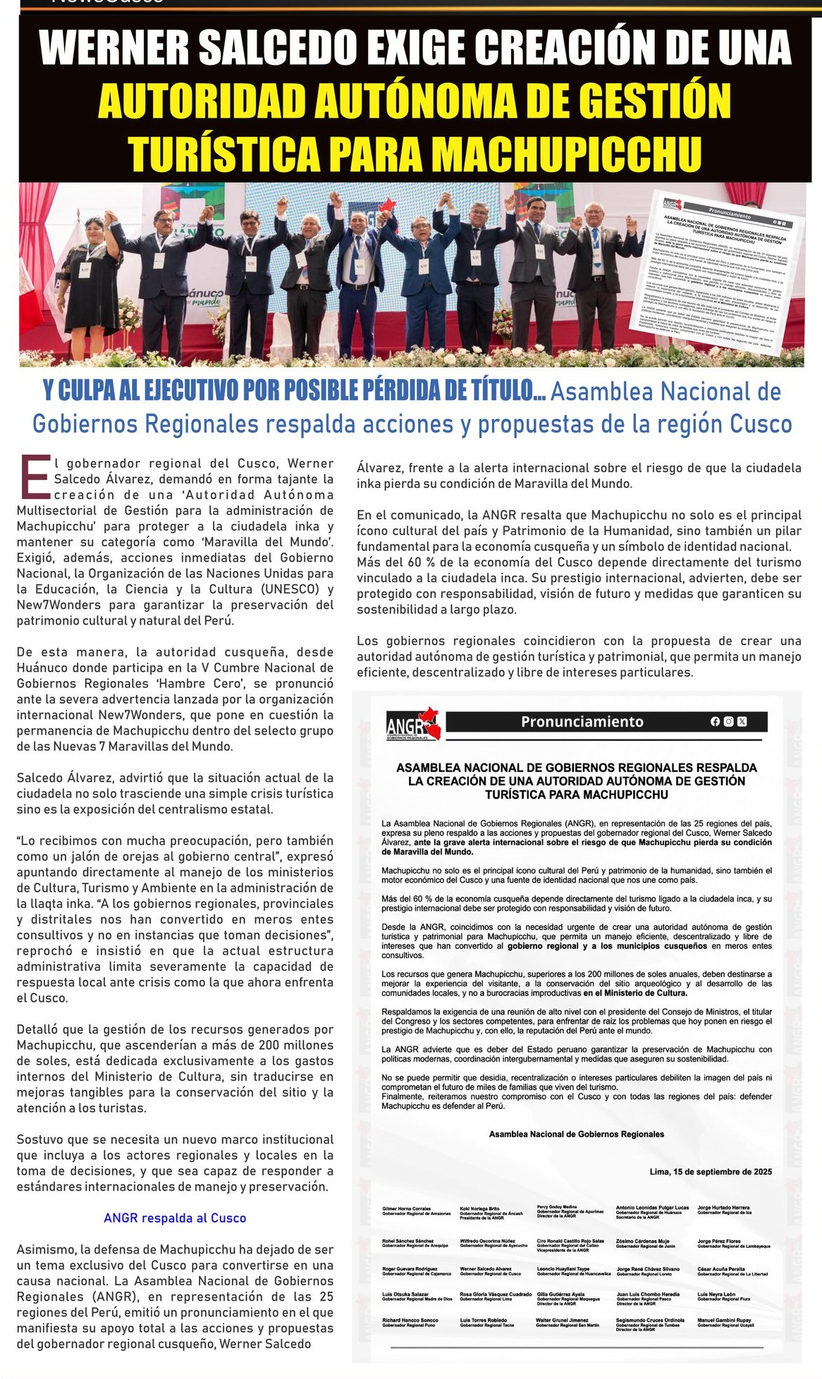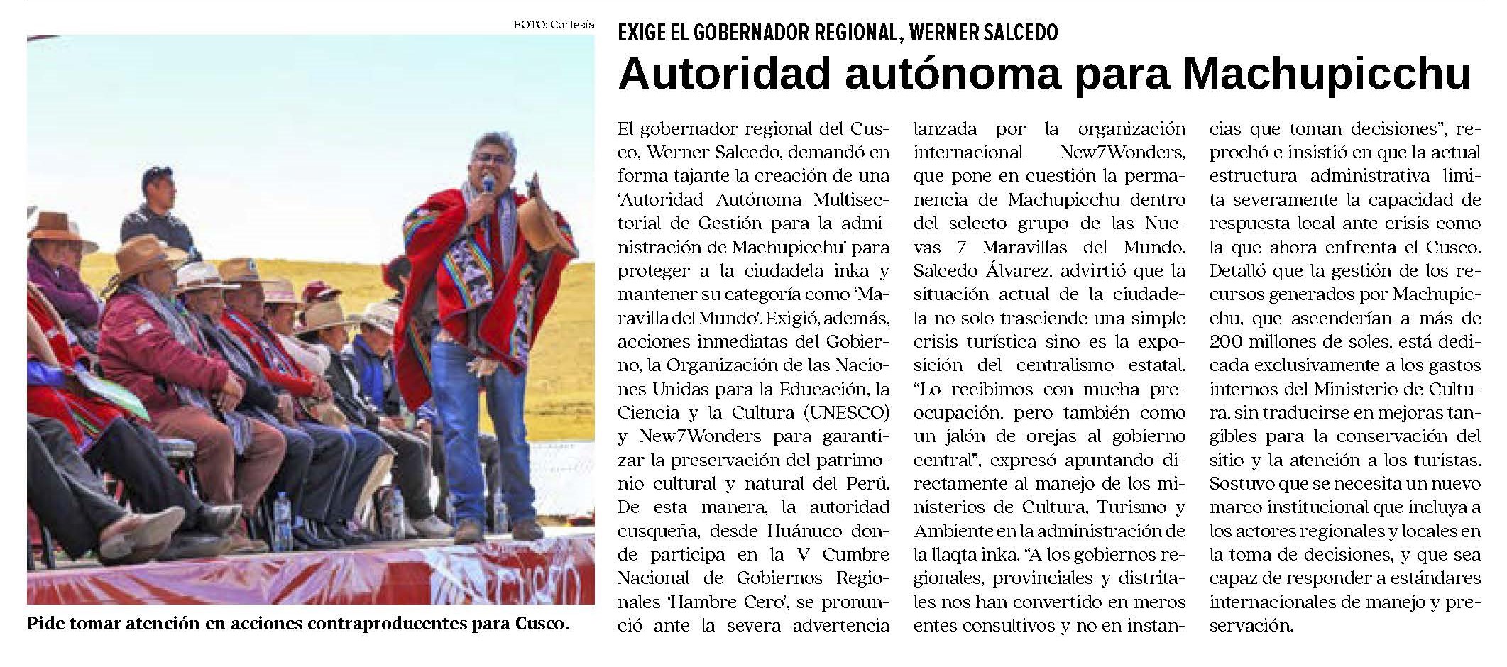 El gobernador regional del Cusco, Werner Salcedo, demandó en forma tajante la creación de una ‘Autoridad Autónoma Multisectorial de Gestión para la administración de Machupicchu’ para proteger a la ciudadela inka y mantener su categoría como ‘Maravilla del Mundo’.