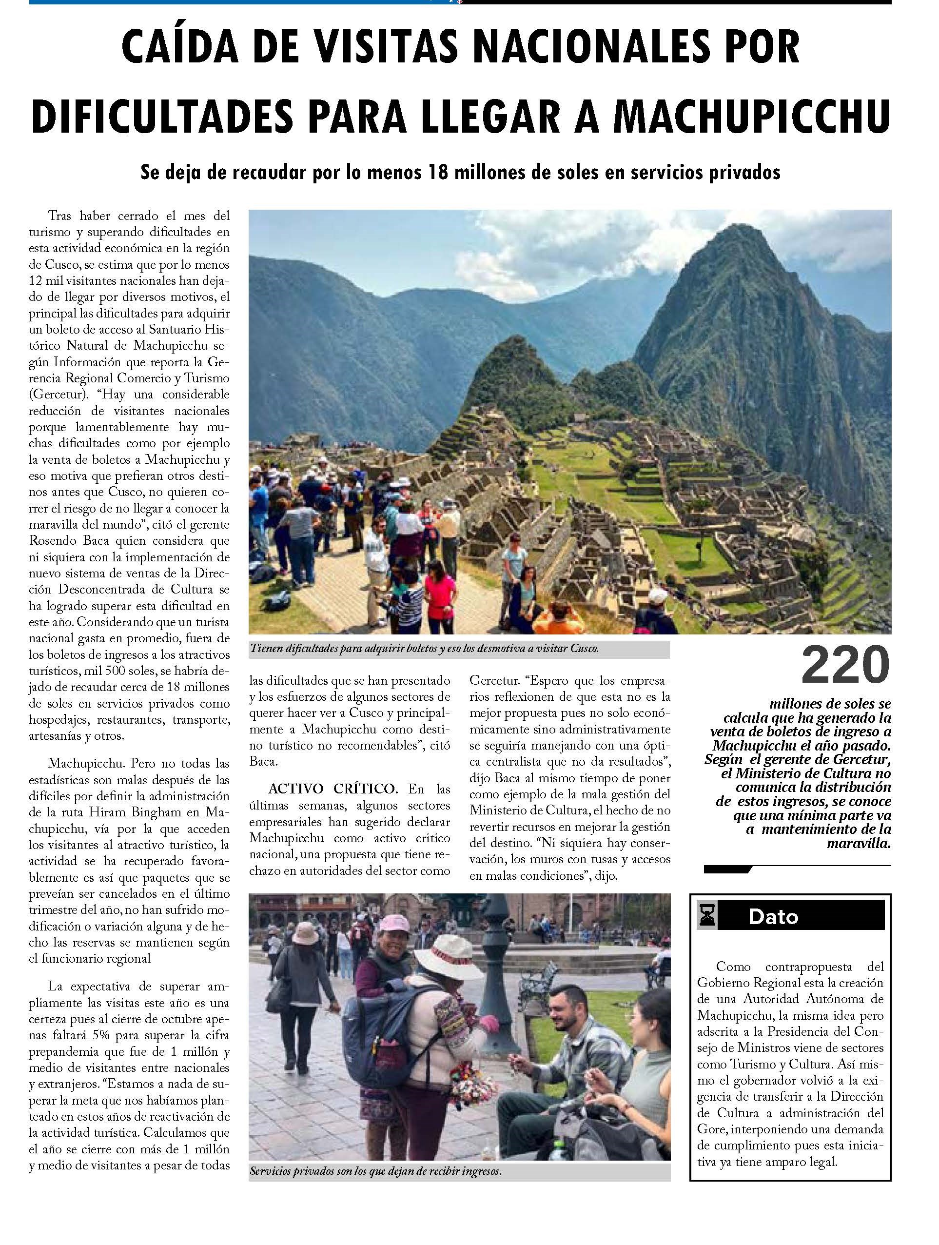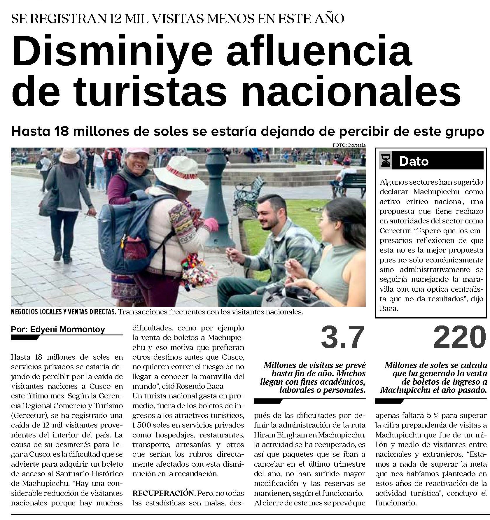 Se estima que por lo menos 12 mil visitantes nacionales han dejado de llegar por diversos motivos, el principal las dificultades para adquirir un boleto de acceso al Santuario Histórico Natural de Machupicchu según Información que reporta la Gerencia Regional Comercio y Turismo (Gercetur).