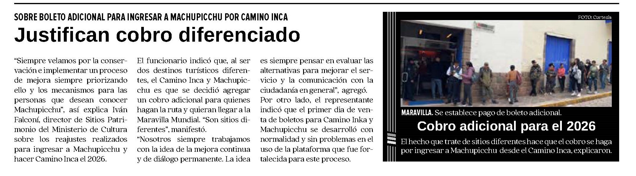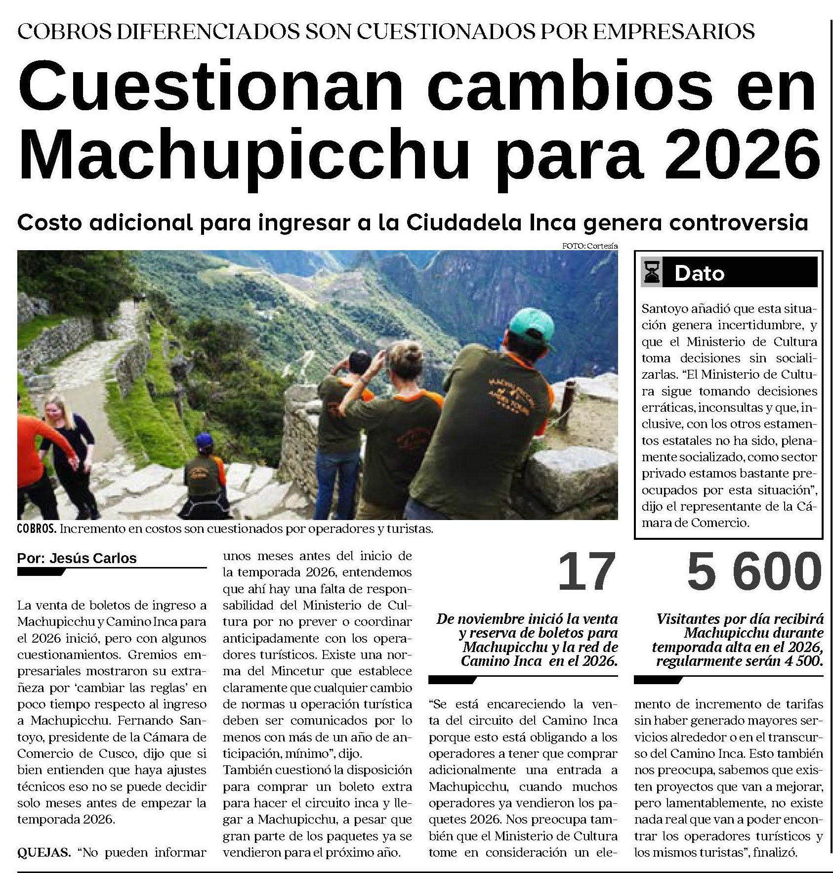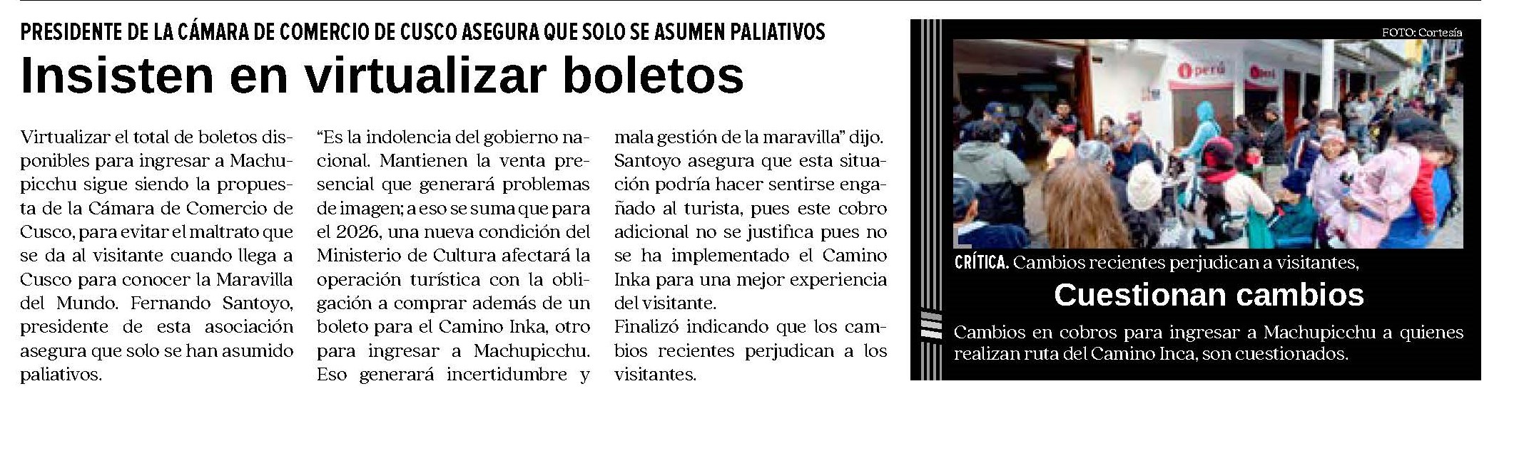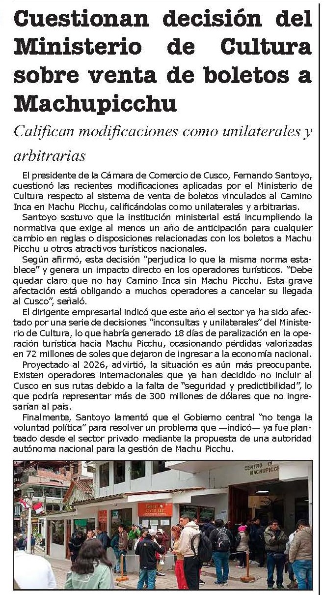 CONTROVERSIA SOBRE CAMBIOS EN EL INGRESO A MACHUPICCHU PARA 2026 Posted by admin | noviembre 26, 2025 La venta de boletos de ingreso a Machupicchu y Camino Inca para el 2026 ha generado controversias hay quienes cuestionan y otros justifican. http://dailynewsperu.com/wp-content/uploads/2025/11/rtv-1.mp4 http://dailynewsperu.com/wp-content/uploads/2025/11/exitosacusco.mp3 Leave a comment Cancel reply Guarda mi nombre, correo electrónico y web en este navegador para la próxima vez que comente. Δ