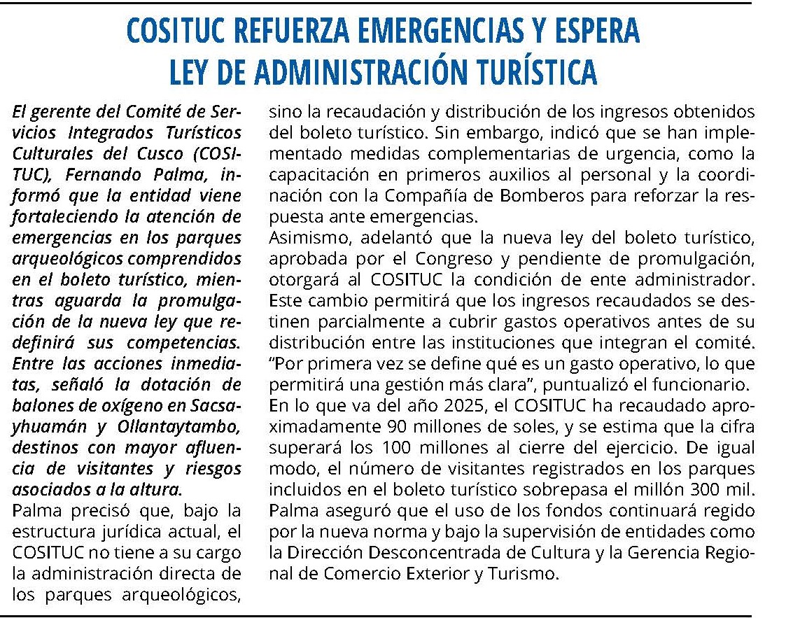 El gerente del Comité de Servicios Integrados Turísticos Culturales del Cusco (COSITUC), Fernando Palma, informó que la entidad viene fortaleciendo la atención de emergencias en los parques arqueológicos comprendidos en el boleto turístico, mientras aguarda la promulgación de la nueva ley que redefinirá sus competencias.