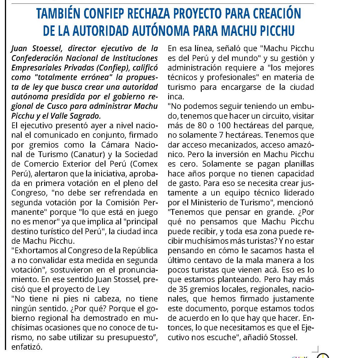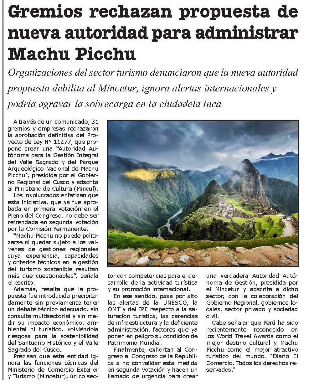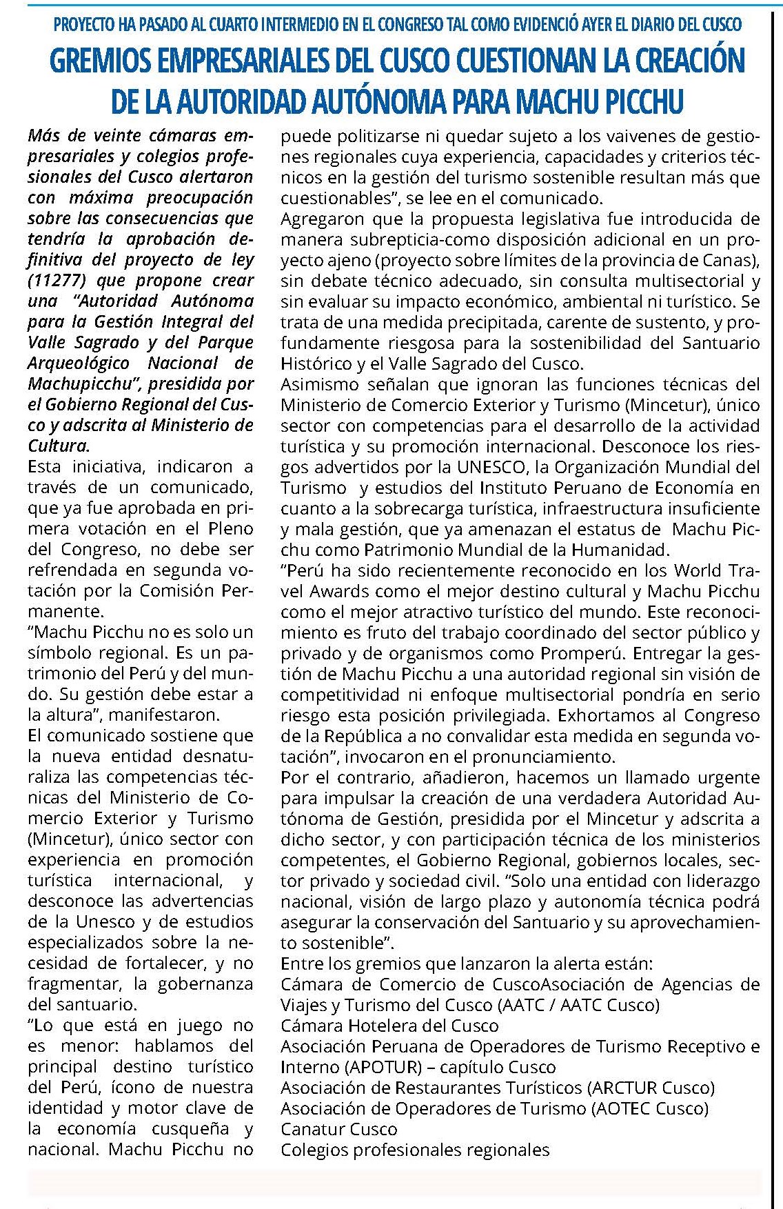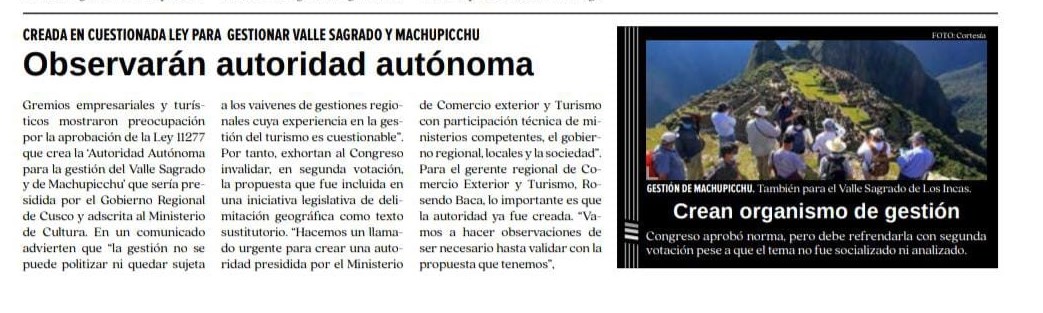 A través de un comunicado, 31 gremios y empresas rechazaron la aprobación definitiva del Proyecto de Ley N° 11277, que propone crear una “Autoridad Autónoma para la Gestión Integral del Valle Sagrado y del Parque Arqueológico Nacional de Machu Picchu”. La Cámara Regional de Turismo de Cusco (Cartuc) señaló que la iniciativa legislativa pone en riesgo la preservación de uno de los patrimonios más importantes del mundo, al trasladar decisiones estratégicas a instancias que según afirmaron no cuentan con la capacidad técnica necesaria