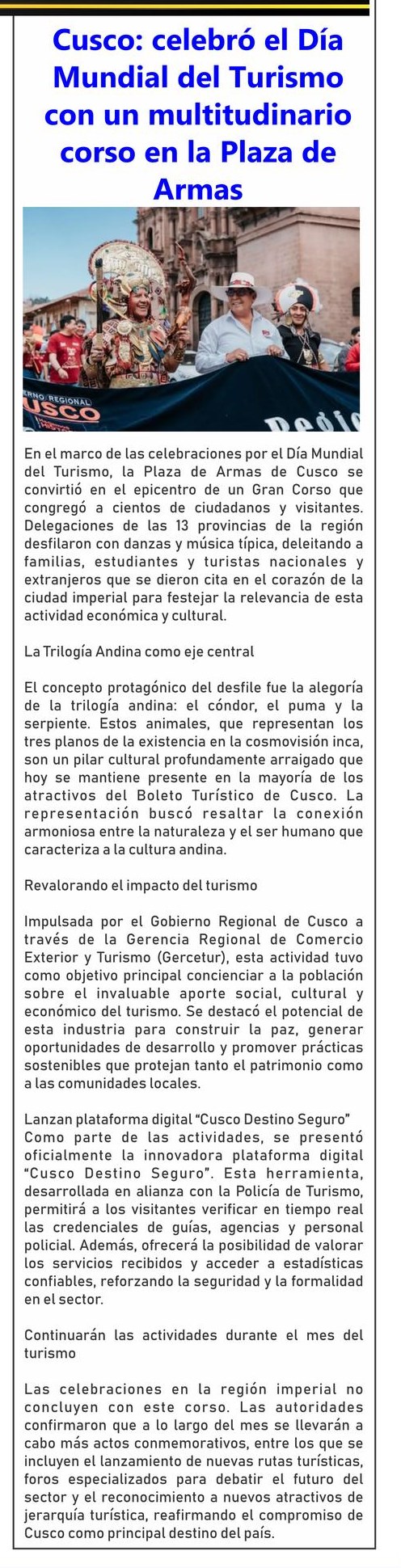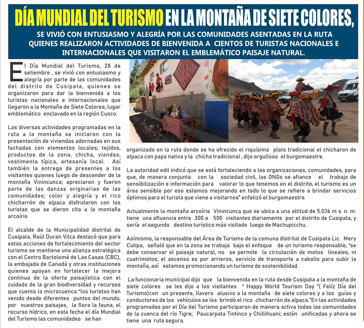 El Día Mundial del Turismo, se vivió con entusiasmo y alegría por parte de las comunidades del distrito de Cusipata, quienes se organizaron para dar la bienvenida a los turistas nacionales e internacionales que llegaron a la Montaña de Siete Colores, lugar emblemático en clavado en la región Cusco.