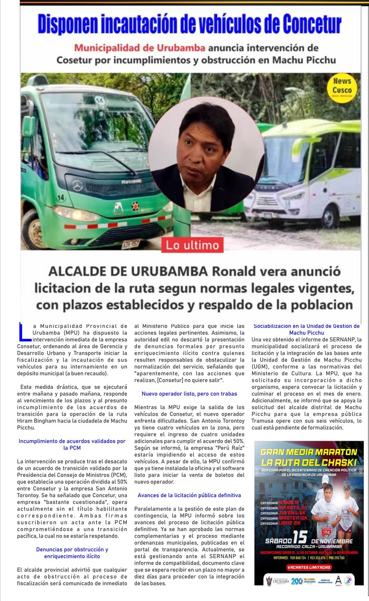 La municipalidad de Urubamba dispuso la intervención inmediata de la empresa Consettur ordenando iniciar la fiscalización e incautación de sus vehículos. Asimismo, anunció penalidades contra San Aantonio de Torontoy por no operar con cabalidad a la fecha.