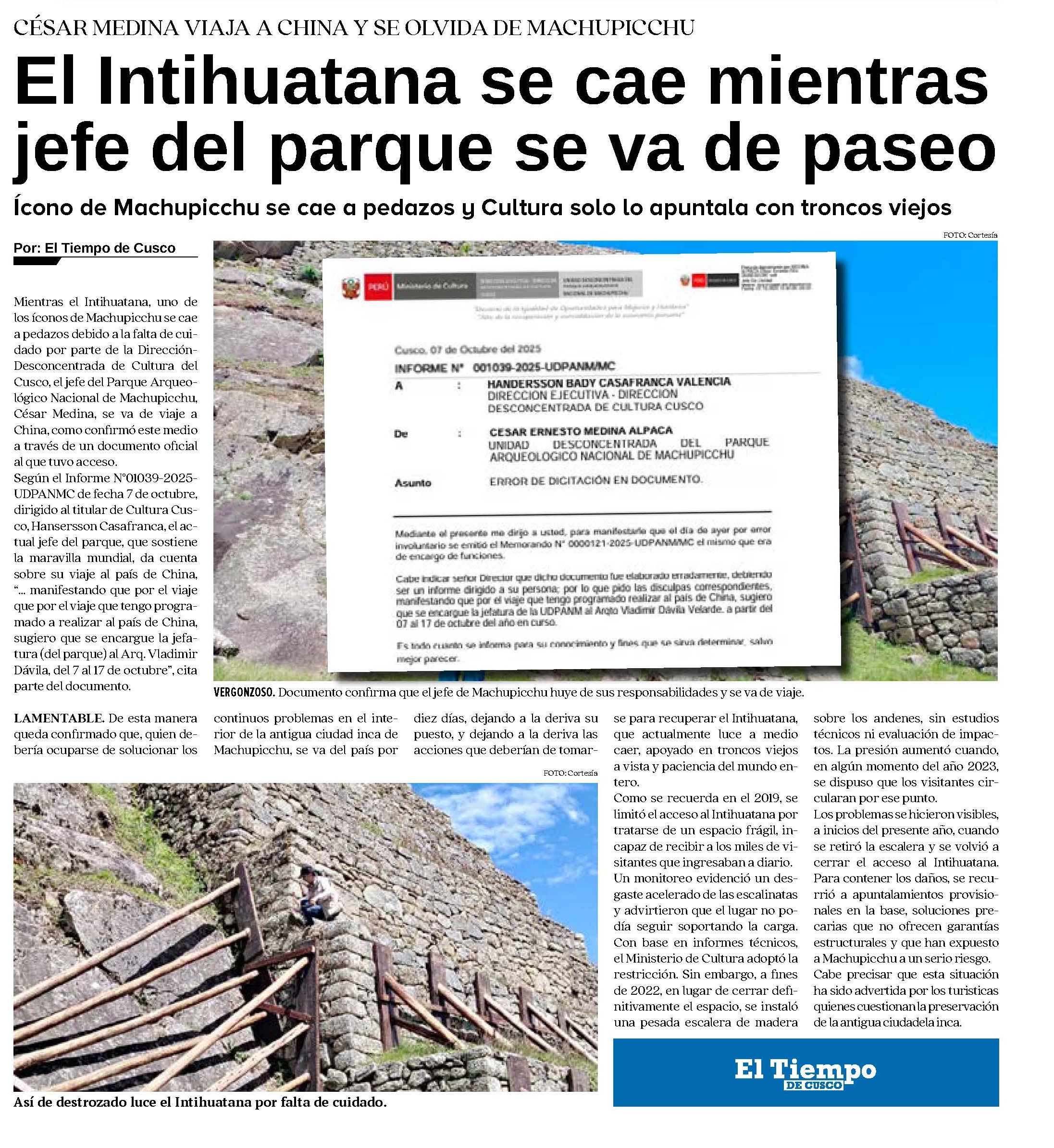 Mientras el Intihuatana, uno de los íconos de Machupicchu se cae a pedazos debido a la falta de cuidado por parte de la Dirección Desconcentrada de Cultura del Cusco, el jefe del Parque Arqueológico Nacional de Machupicchu, César Medina, se va de viaje a China.