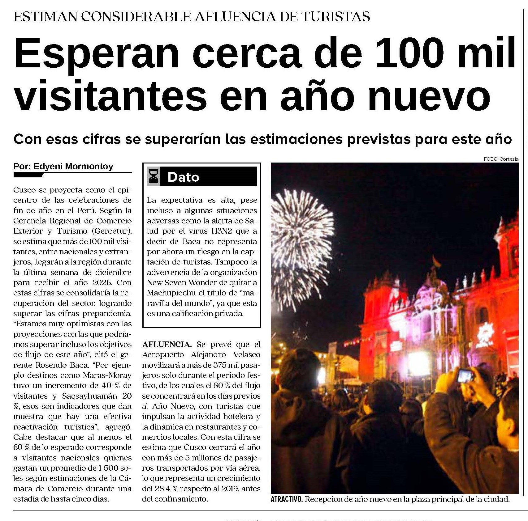 Cusco se proyecta como el epicentro de las celebraciones de fin de año en el Perú. Según la Gerencia Regional de Comercio Exterior y Turismo (Gercetur), se estima que más de 100 mil visitantes, entre nacionales y extranjeros, llegarán a la región durante la última semana de diciembre para recibir el año 2026.