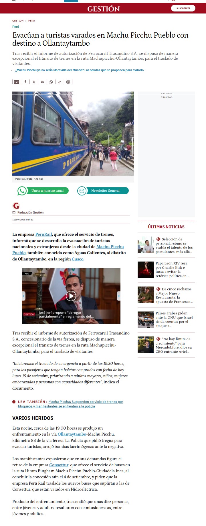 La empresa PeruRail, que ofrece el servicio de trenes, informó que se desarrolla la evacuación de turistas nacionales y extranjeros desde la ciudad de Machu Picchu Pueblo, también conocida como Aguas Calientes, al distrito de Ollantaytambo, en la región Cusco.