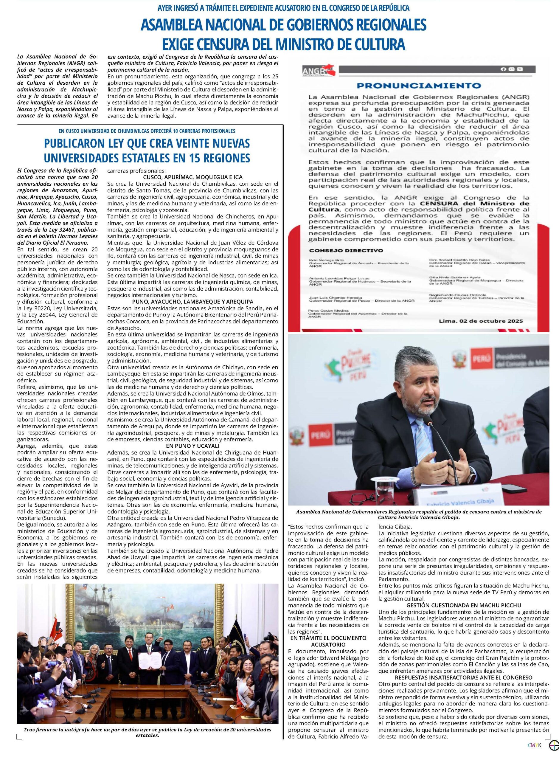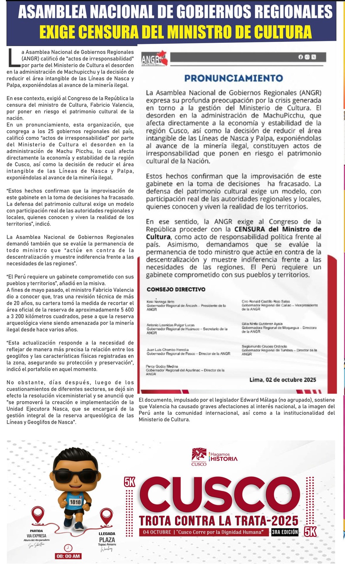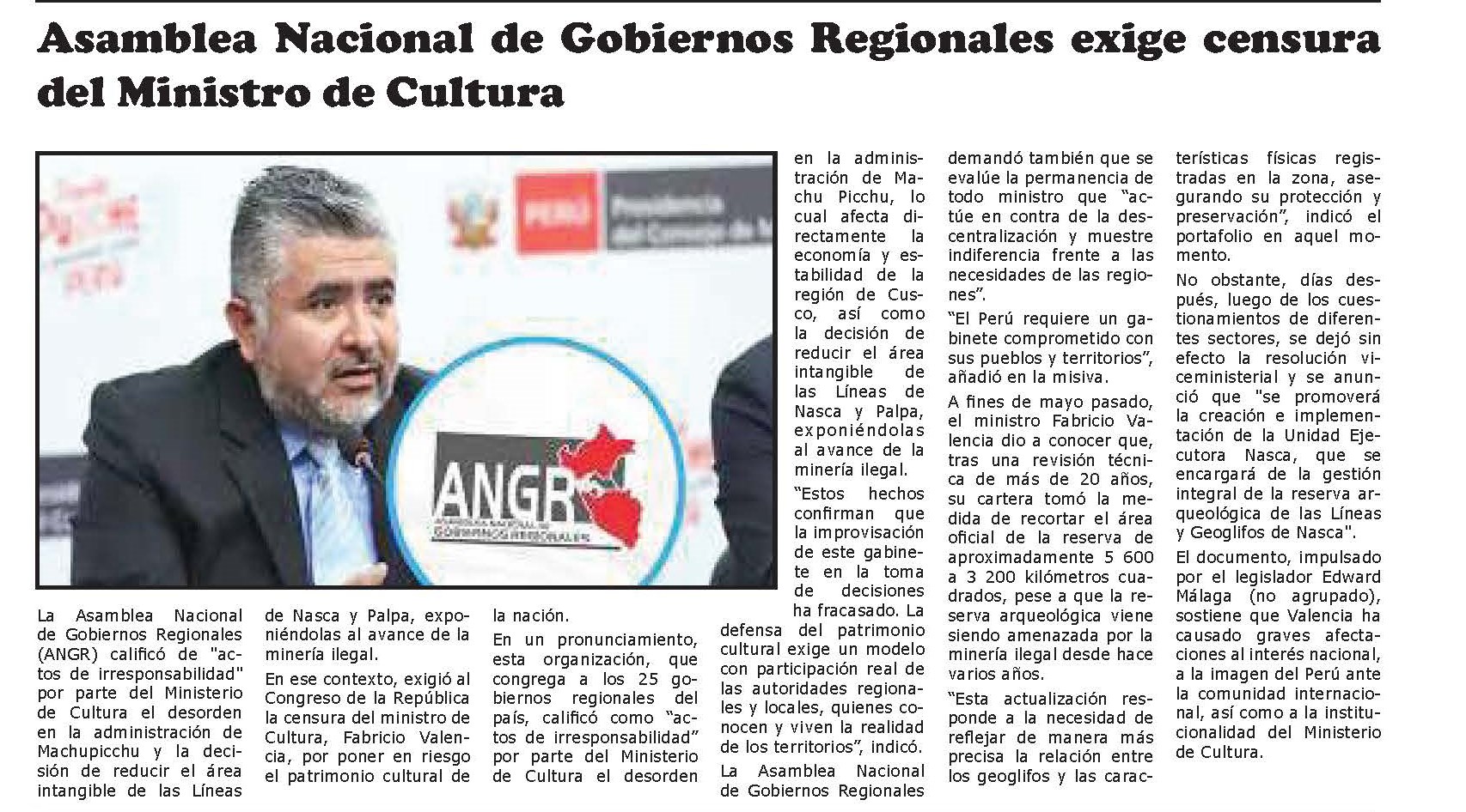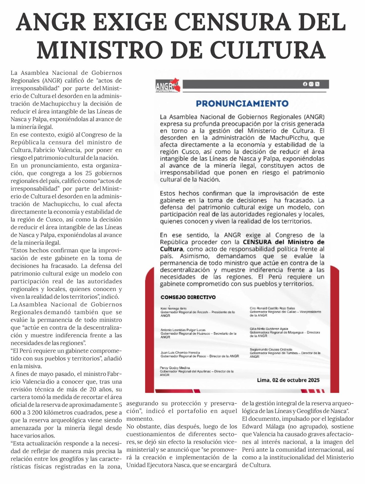 La Asamblea Nacional de Gobiernos Regionales (ANGR) calificó de “actos de irresponsabilidad” por parte del Ministerio de Cultura el desorden en la administración de Machupicchu y la decisión de reducir el área intangible de las Líneas de Nasca y Palpa, exponiéndolas al avance de la minería ilegal.