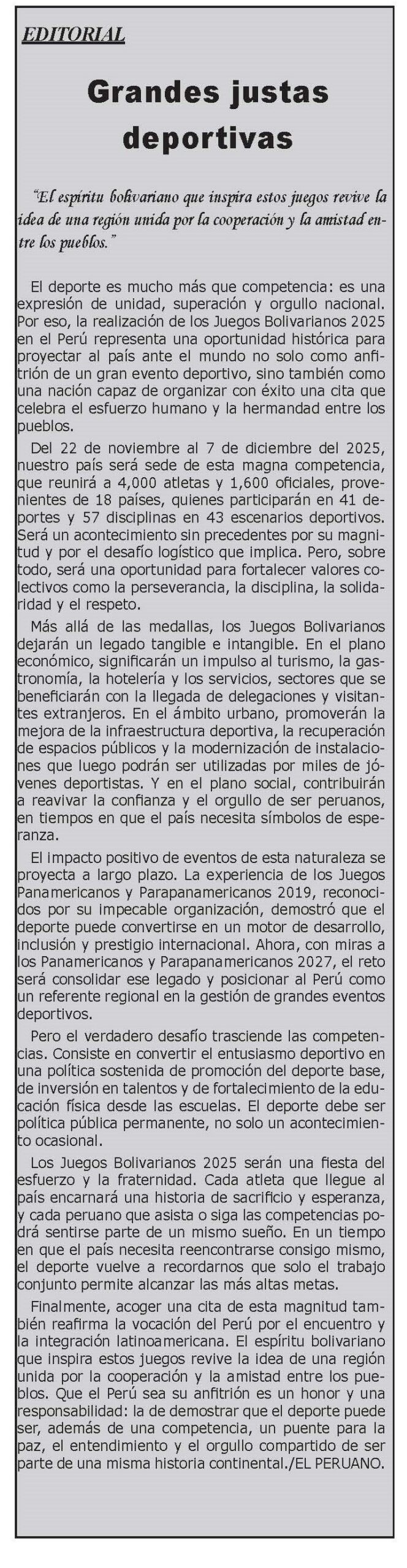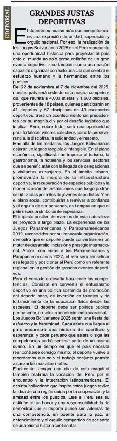 (…) Más allá de las medallas, los Juegos Bolivarianos dejarán un legado tangible e intangible. En el plano económico, significarán un impulso al turismo, la gastronomía, la hotelería y los servicios, sectores que se beneficiarán con la llegada de delegaciones y visitantes extranjeros.