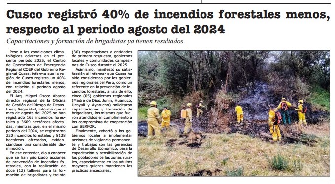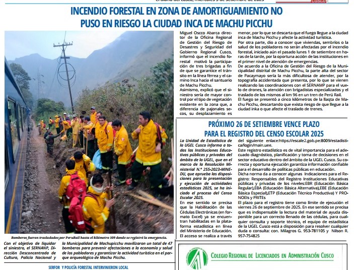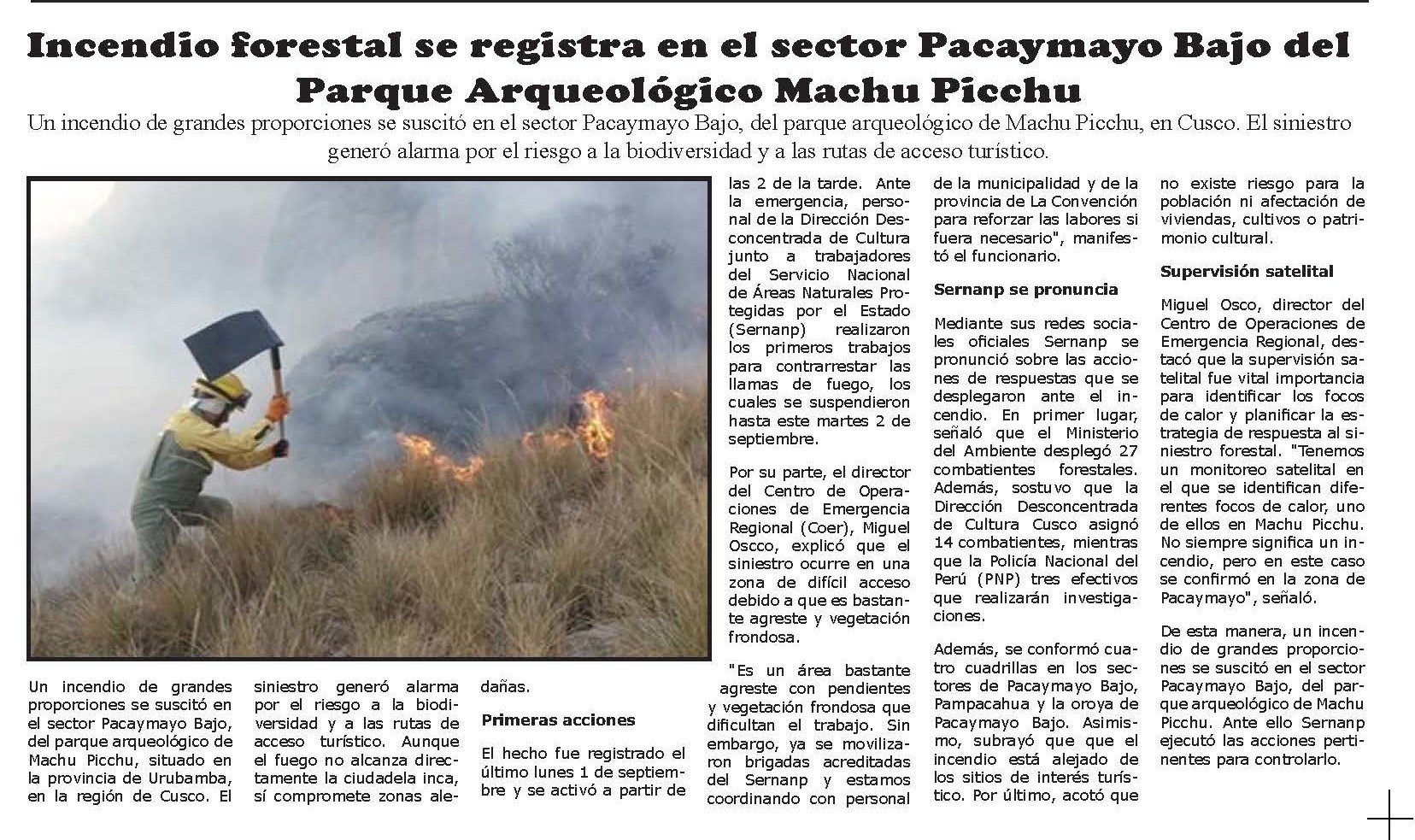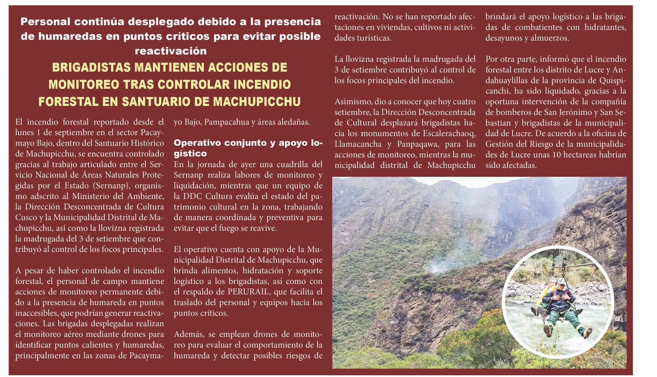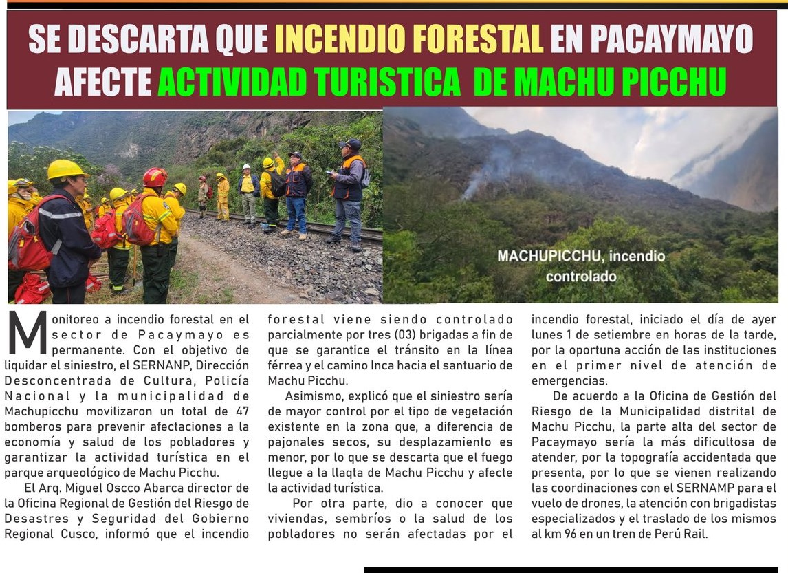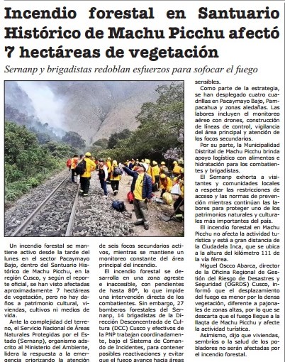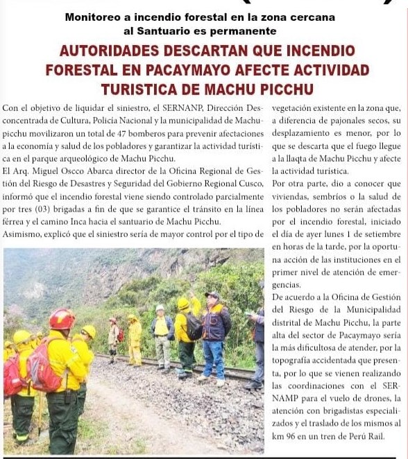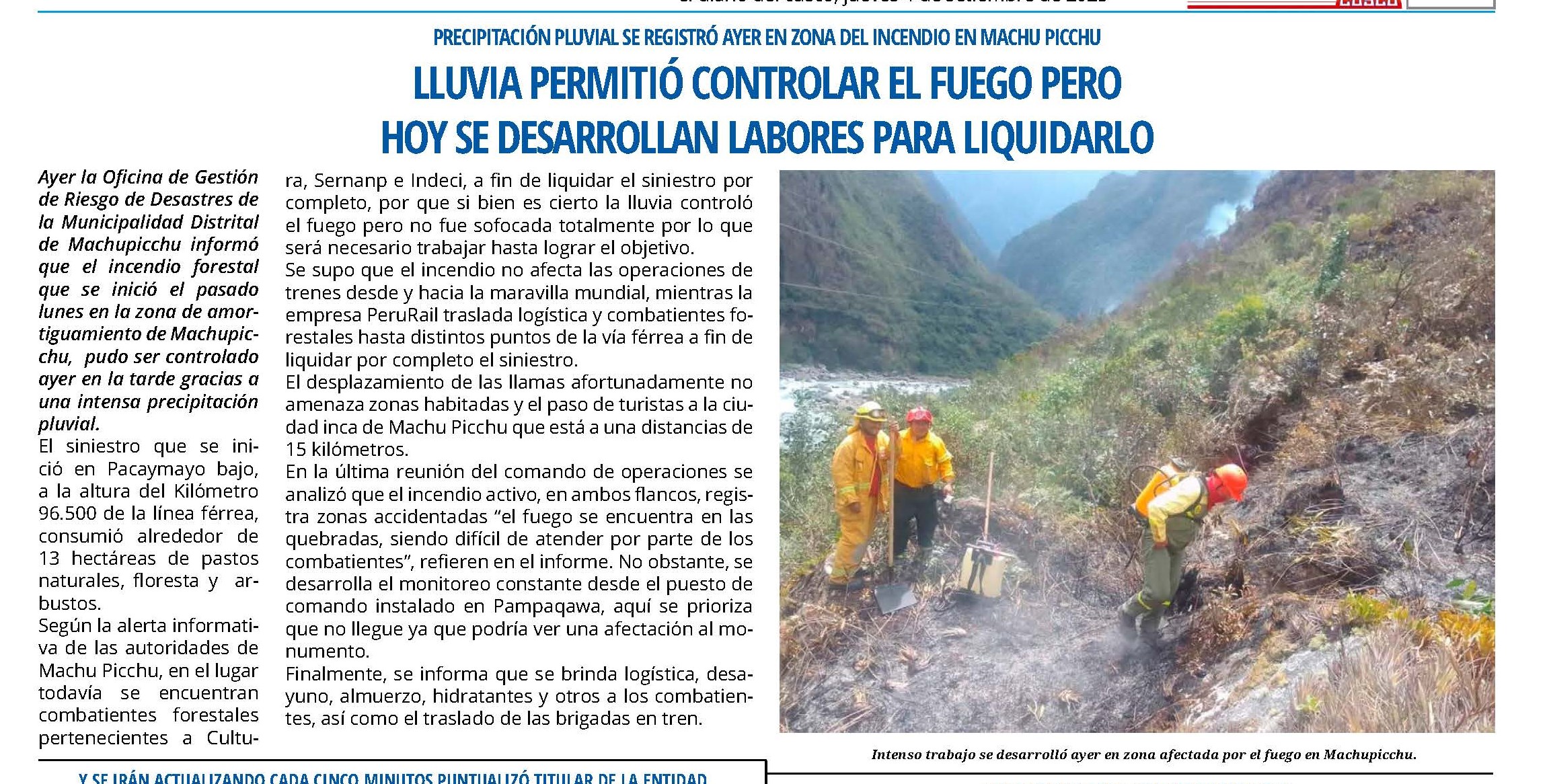 El incendio forestal que se inició el pasado lunes en la zona de amortiguamiento de Machu Picchu pudo ser controlado gracias a una intensa precipitación pluvial. Se supo que el incendio no afecta las operaciones de trenes desde y hacia la maravilla mundial.