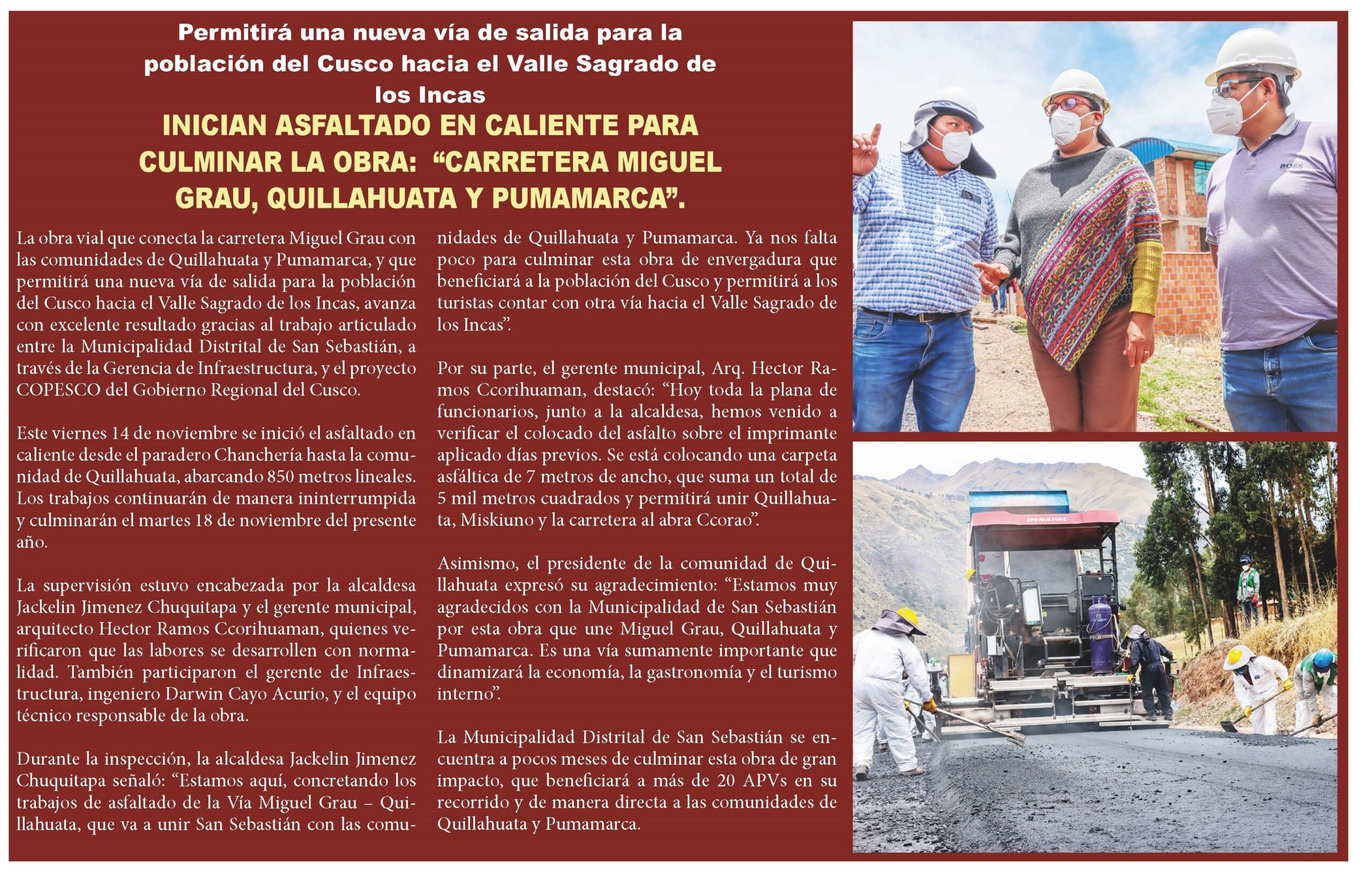 (…) Asimismo, el presidente de la comunidad de Quillahuata expresó su agradecimiento: “Estamos muy agradecidos con la Municipalidad de San Sebastián por esta obra que une Miguel Grau, Quillahuata y Pumamarca. Es una vía que dinamizará la economía y el turismo interno”.