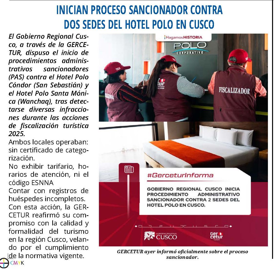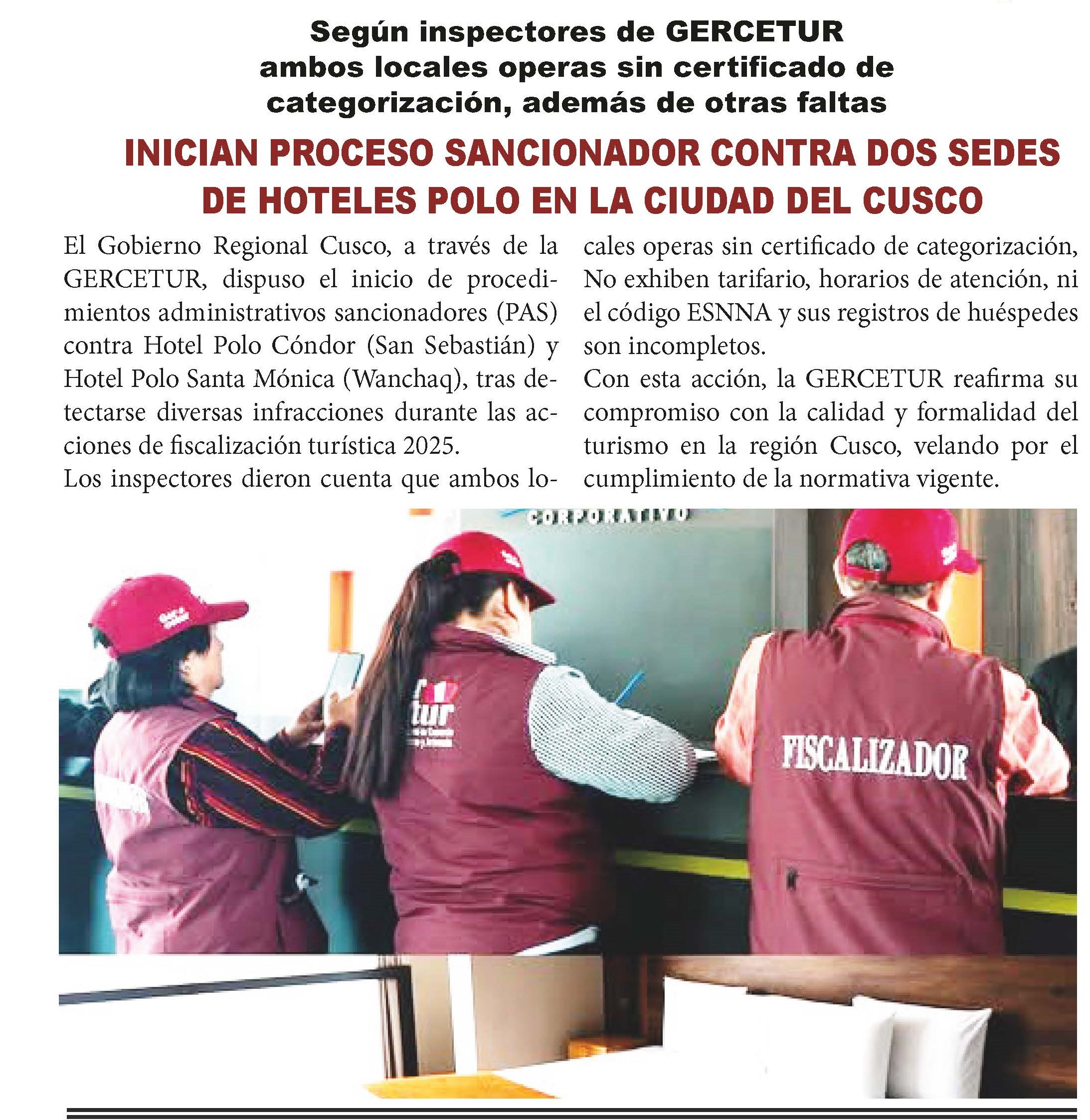 El Gobierno Regional Cusco, a través de la GERCETUR, dispuso el inicio de procedimientos administrativos sancionadores contra el Hotel Polo Cóndor (San Sebastián) y el Hotel Polo Santa Mónica (Wanchaq), tras detectarse diversas infracciones durante las acciones de fiscalización turística 2025.