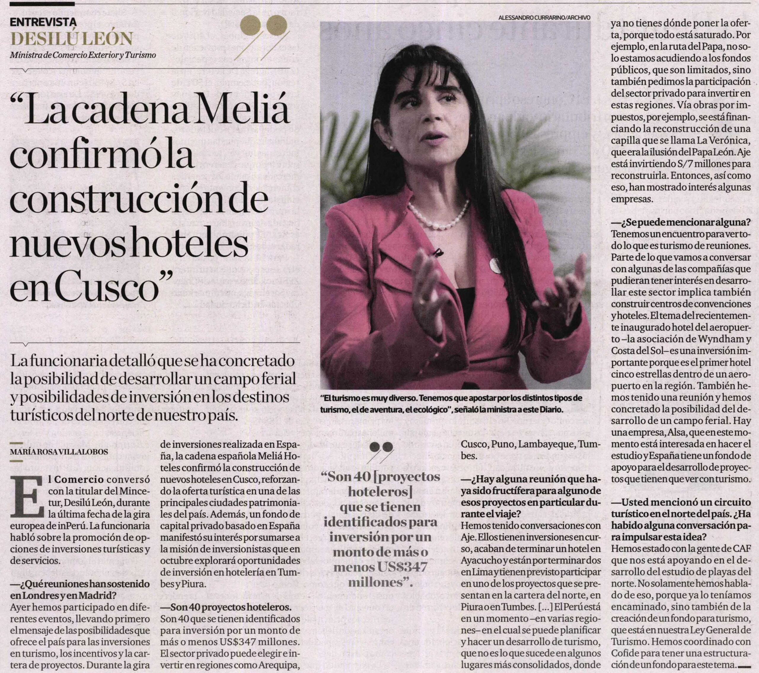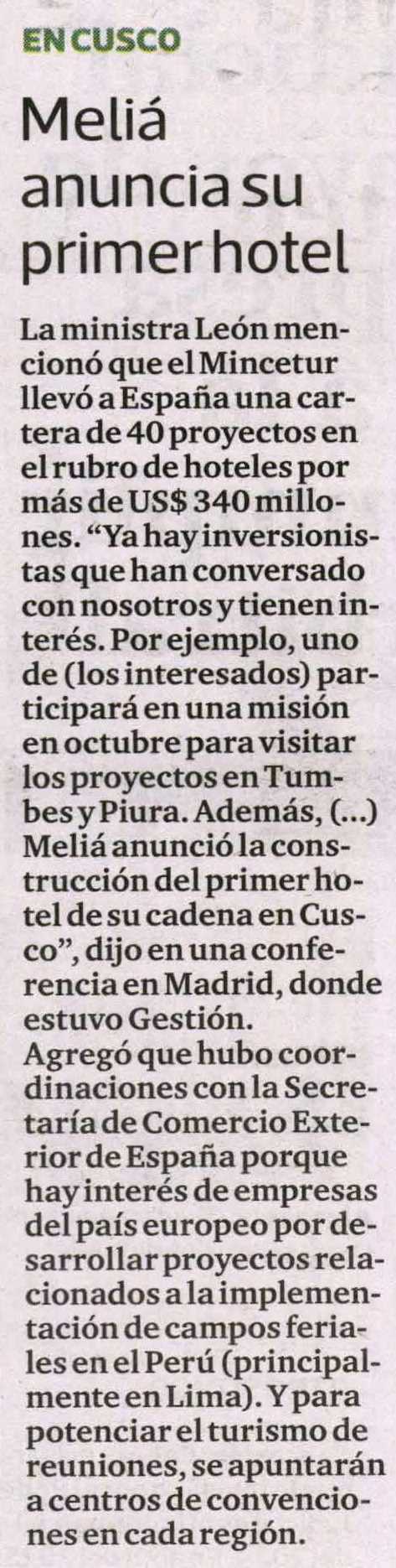 “Durante la gira de inversiones realizada en España, la cadena española Meliá Hoteles confirmó la construcción de nuevos hoteles en Cusco, reforzando la oferta turística en una de las principales ciudades patrimoniales del país.”  Informó la titular del Mincetur