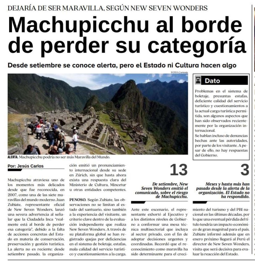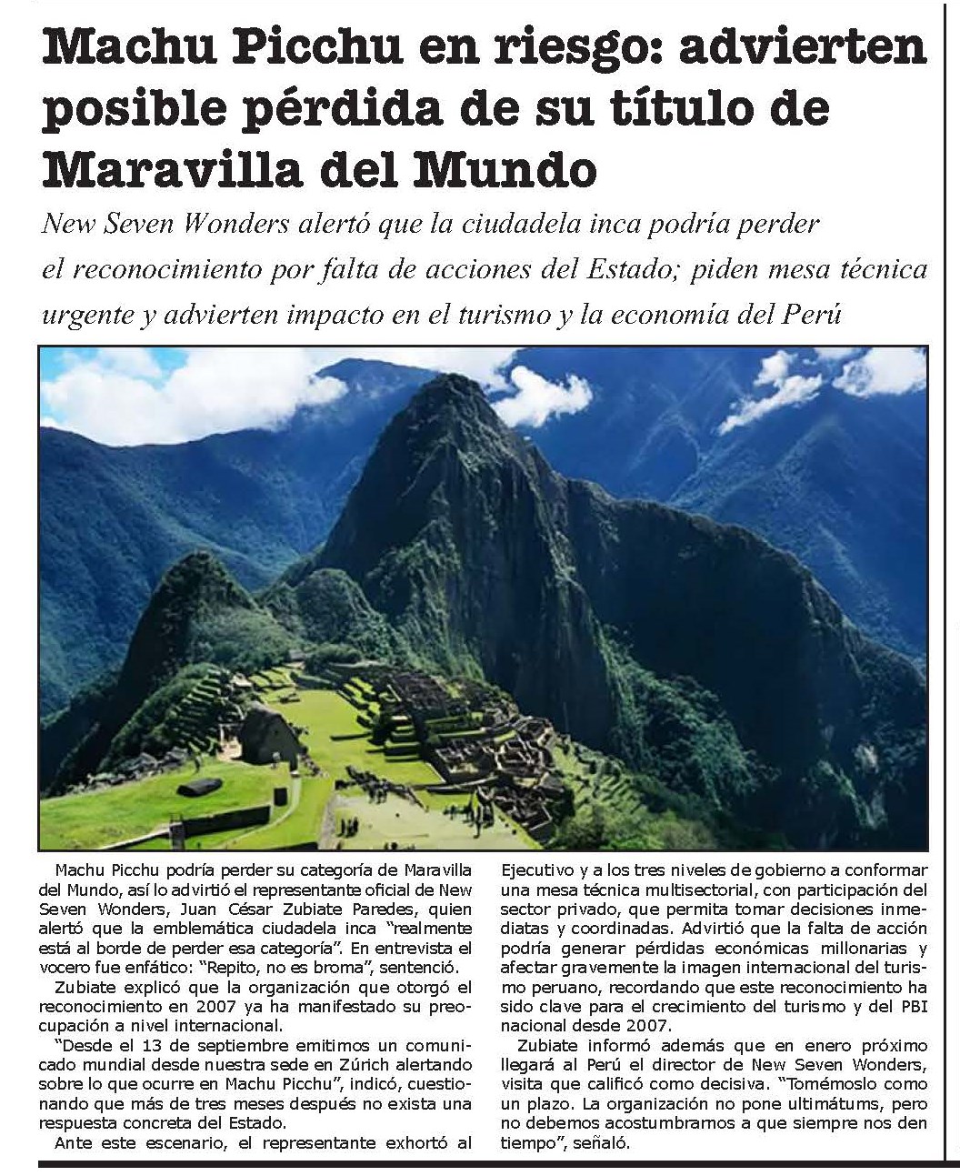 Machu Picchu podría perder su categoría de Maravilla del Mundo, así lo advirtió el representante oficial de New Seven Wonders, Juan César Zubiate Paredes, quien alertó que la emblemática ciudadela inca “realmente está al borde de perder esa categoría”.