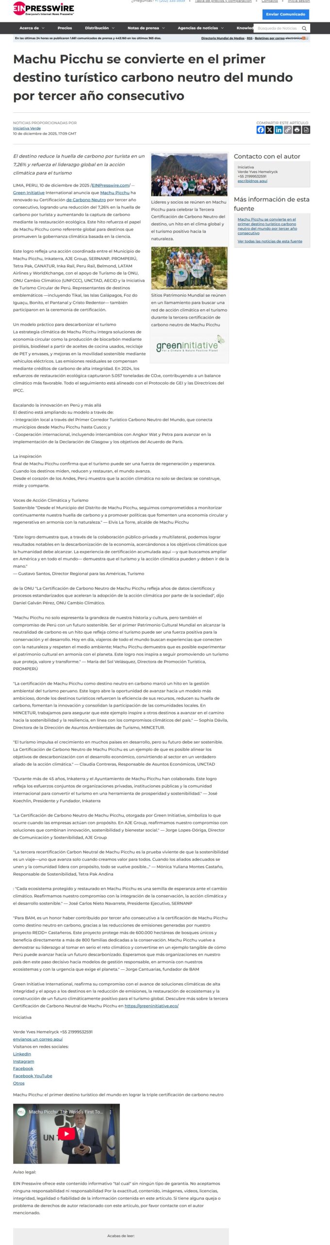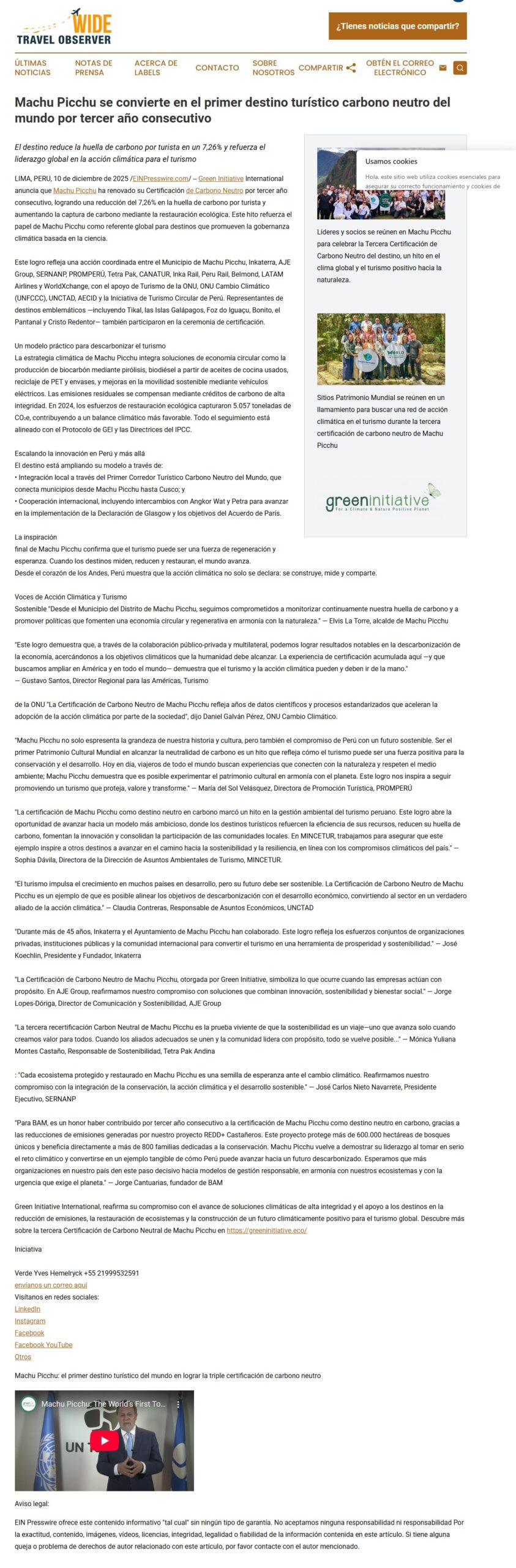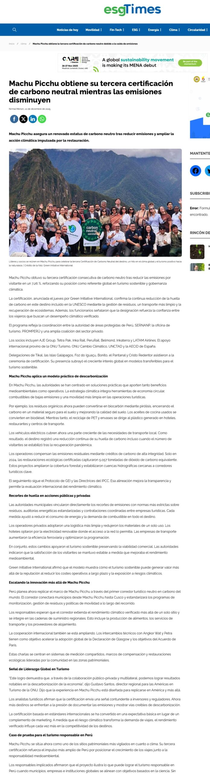 Machupicchu renueva su certificación de Carbono Neutro logrando una reducción de 7,26 % en la huella de carbono. Este logro refleja una acción coordinada entre el Municipio de Machu Picchu, Inkaterra, AJE Group, Sernanp, Promperú, Tetra Pak, Canatur, Inca Rail, Perú Rail, Belmond, Latam Airlines y WorldXchange, con el apoyo de Turismo de la ONU, ONU Cambio Climático (UNFCCC), UNCTAD, AECID y la Iniciativa de Turismo Circular de Perú.