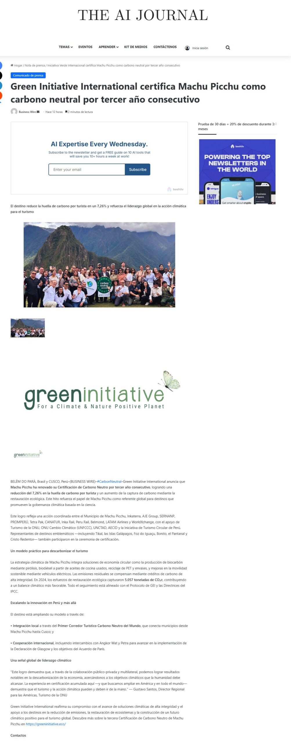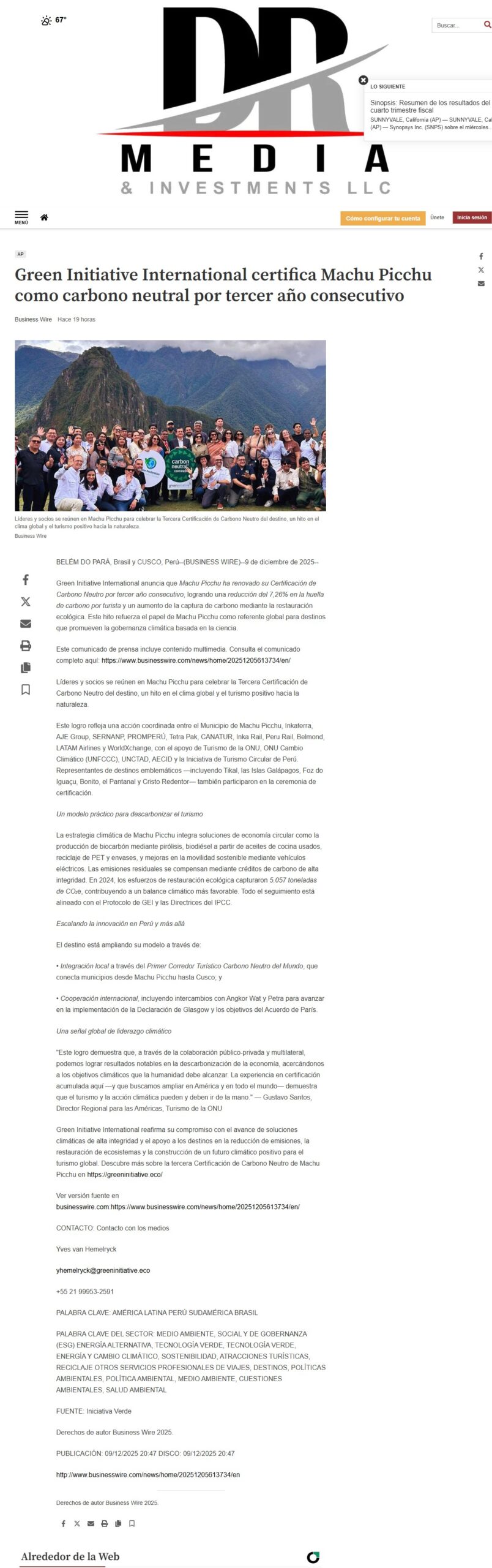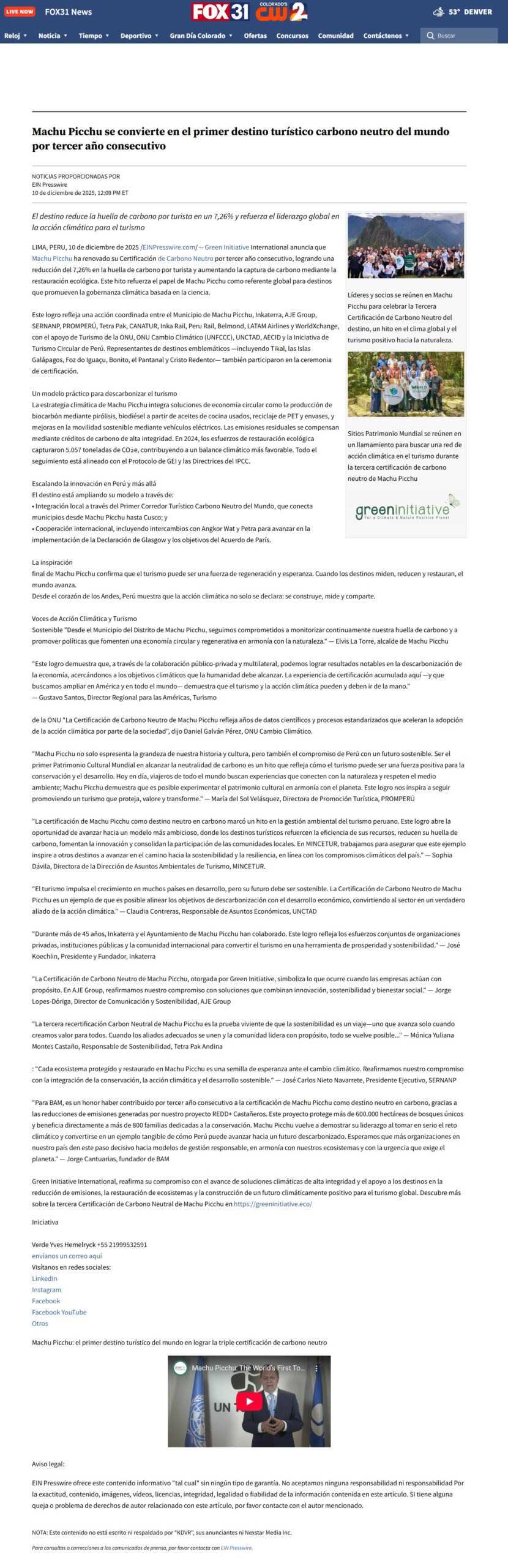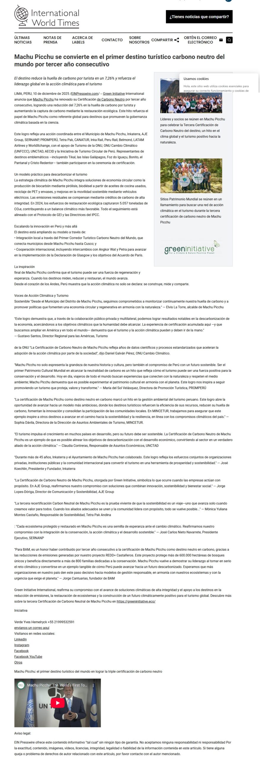 Machupicchu renueva su certificación de Carbono Neutro logrando una reducción de 7,26 % en la huella de carbono. Este logro refleja una acción coordinada entre el Municipio de Machu Picchu, Inkaterra, AJE Group, Sernanp, Promperú, Tetra Pak, Canatur, Inca Rail, Perú Rail, Belmond, Latam Airlines y WorldXchange, con el apoyo de Turismo de la ONU, ONU Cambio Climático (UNFCCC), UNCTAD, AECID y la Iniciativa de Turismo Circular de Perú.