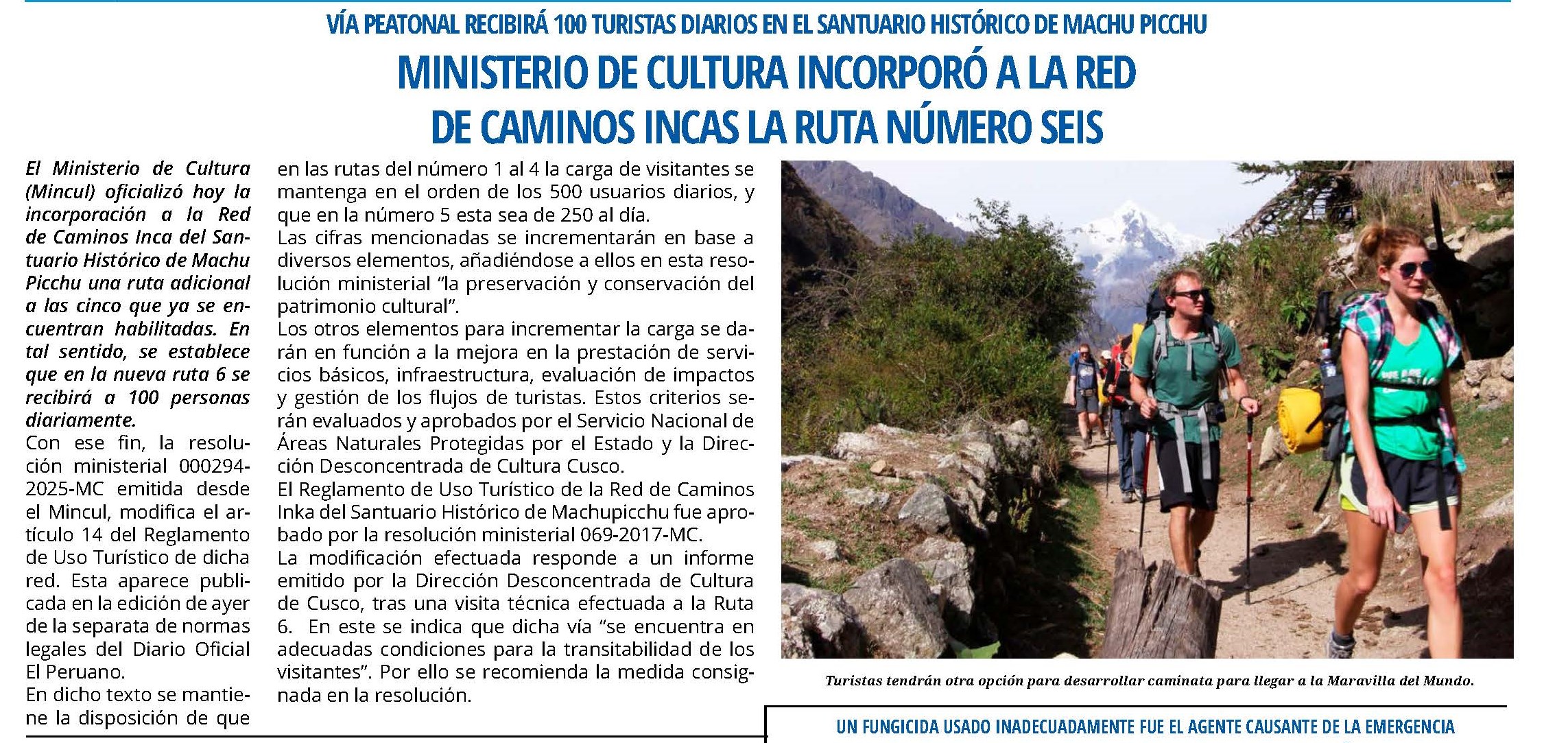 El Ministerio de Cultura (Mincul) oficializó hoy la incorporación a la Red de Caminos Inca del Santuario Histórico de Machu Picchu una ruta adicional a las cinco que ya se encuentran habilitadas. En tal sentido, se establece que en la nueva ruta 6 se recibirá a 100 personas diariamente.