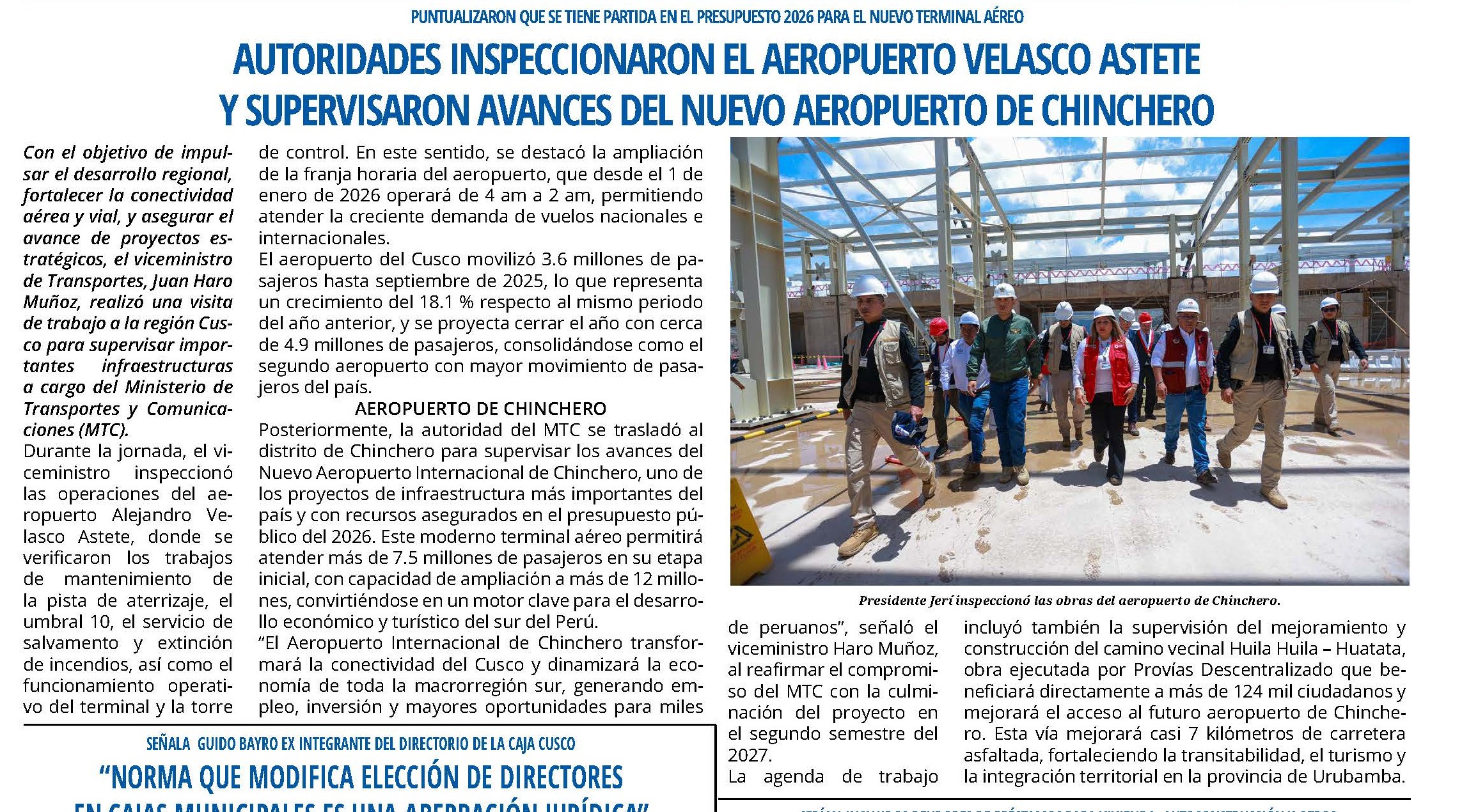 Autoridades del MTC inspeccionaron el aeropuerto Velasco Astete y supervisaron avances del nuevo aeropuerto de Chinchero con el objetivo de impulsar el desarrollo regional.