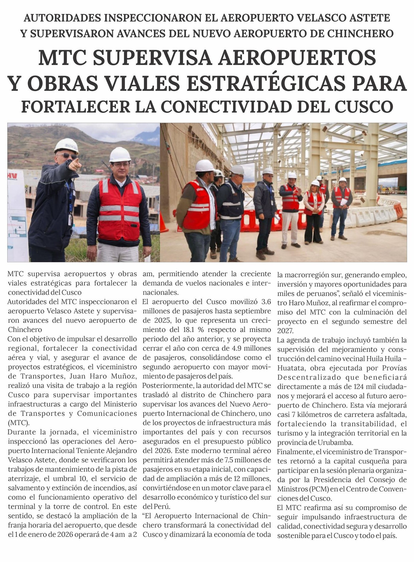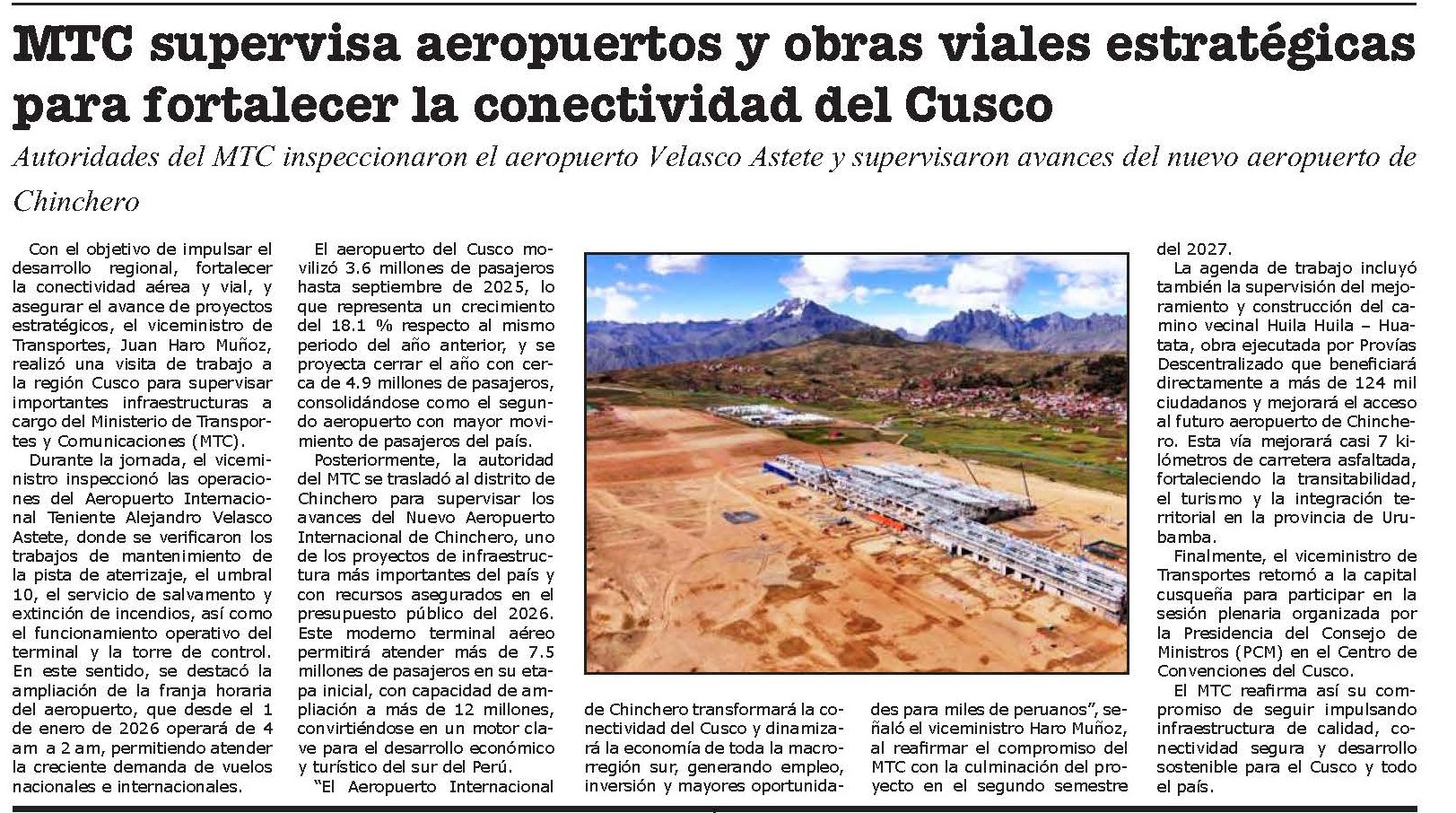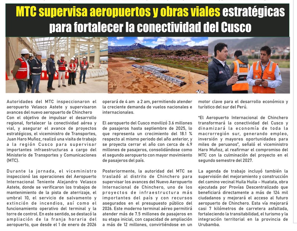 MTC SUPERVISA AEROPUERTOS Y OBRAS VIALES PARA FORTALECER LA CONECTIVIDAD DEL CUSCO