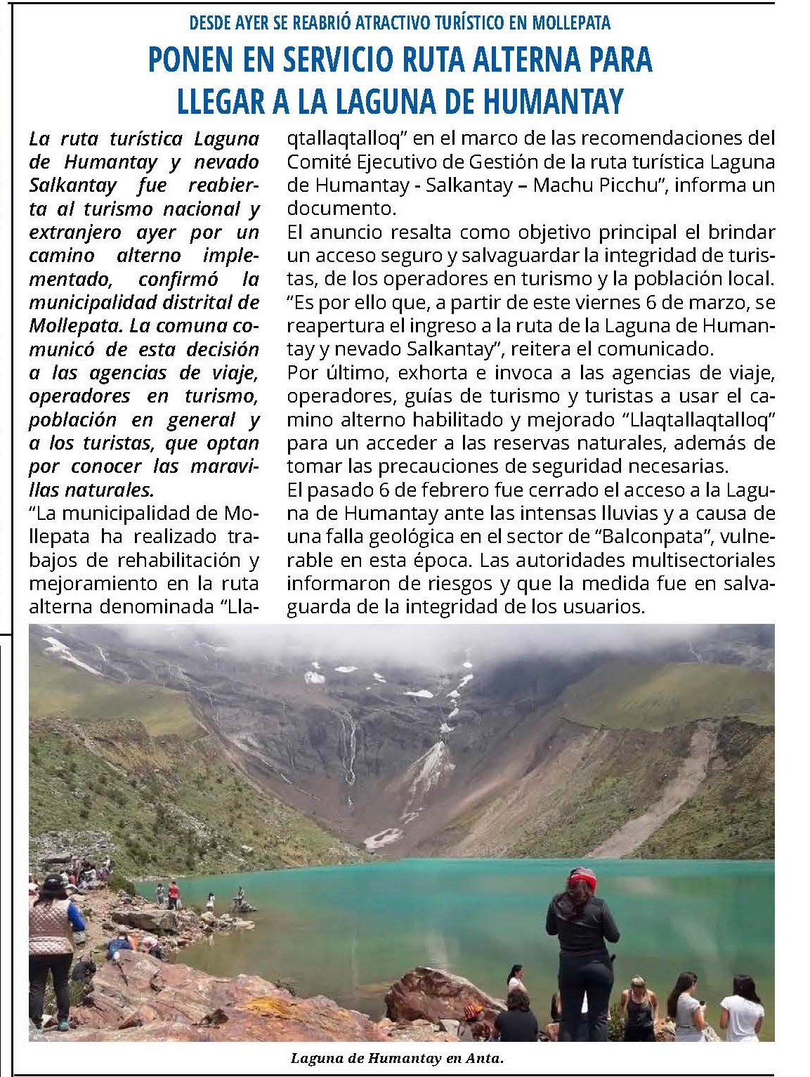 La ruta turística Laguna de Humantay y nevado Salkantay fue reabierta al turismo nacional y extranjero ayer por un camino alterno implementado, confirmó la municipalidad distrital de Mollepata. La comuna comunicó de esta decisión a las agencias de viaje, operadores en turismo, población en general y a los turistas, que optan por conocer las maravillas naturales.