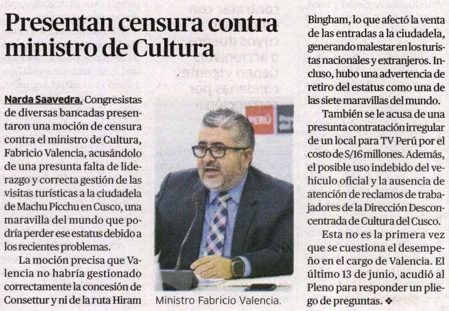 Congresistas de diversas bancadas presentaron una moción de censura contra el ministro de Cultura, Fabricio Valencia, acusándolo de una presunta falta de liderazgo y correcta gestión de las visitas turísticas a la ciudadela de Machu Picchu en Cusco, una maravilla del mundo que podría perder ese estatus debido a los recientes problemas.