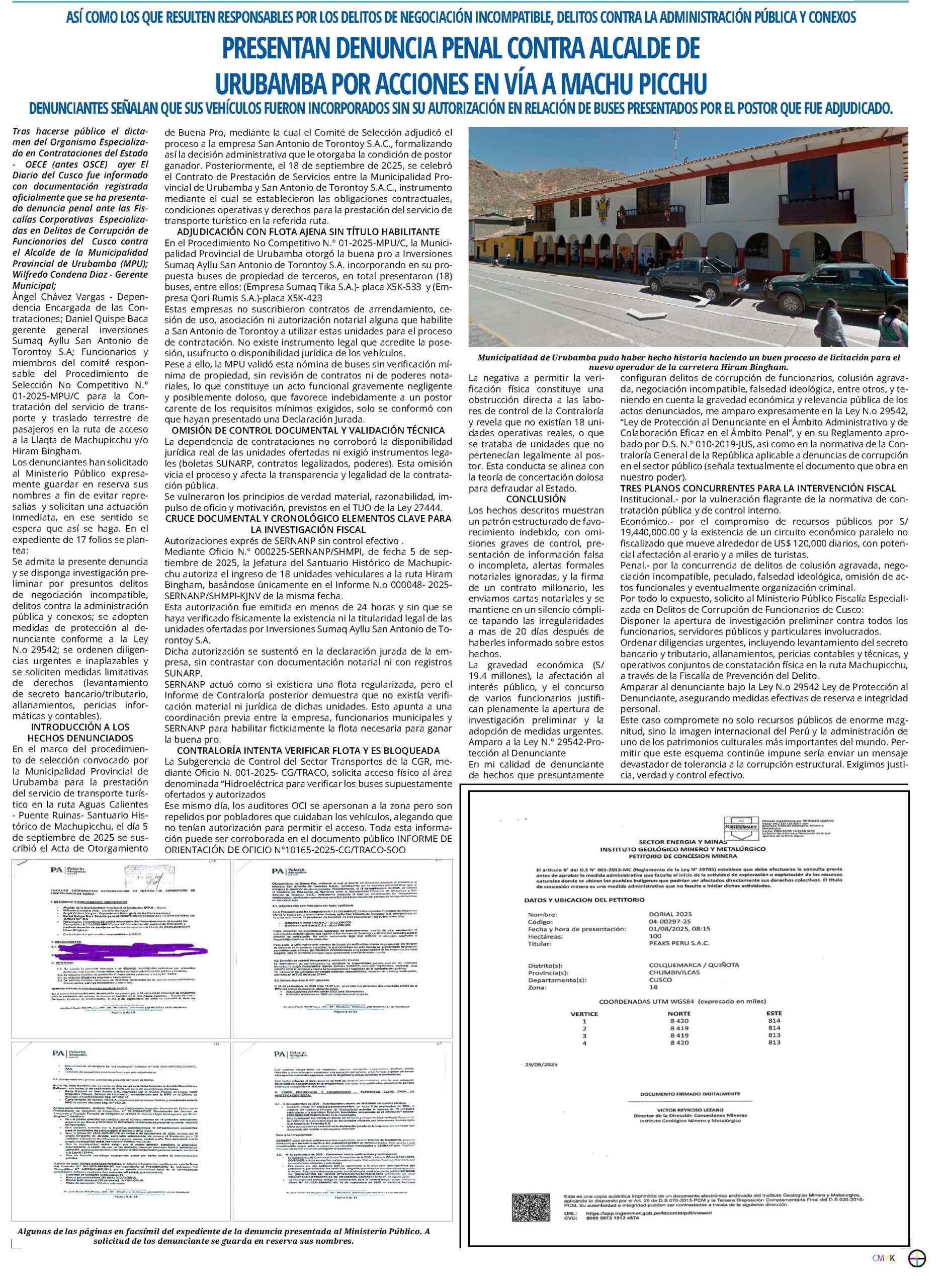 (…) Además contra Ángel Chávez Vargas, Dependencia Encargada de las Contrataciones; Daniel Quispe Baca gerente general inversiones Sumaq Ayllu San Antonio de Torontoy S.A; Funcionarios y miembros del comité responsable del Procedimiento de Selección No Competitivo N.° 01-2025-MPU/C para la Contratación del servicio de transporte y traslado terrestre de pasajeros en la ruta de acceso a la Llaqta de Machupicchu y/o Hiram Bingham.