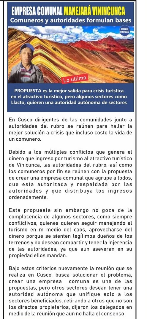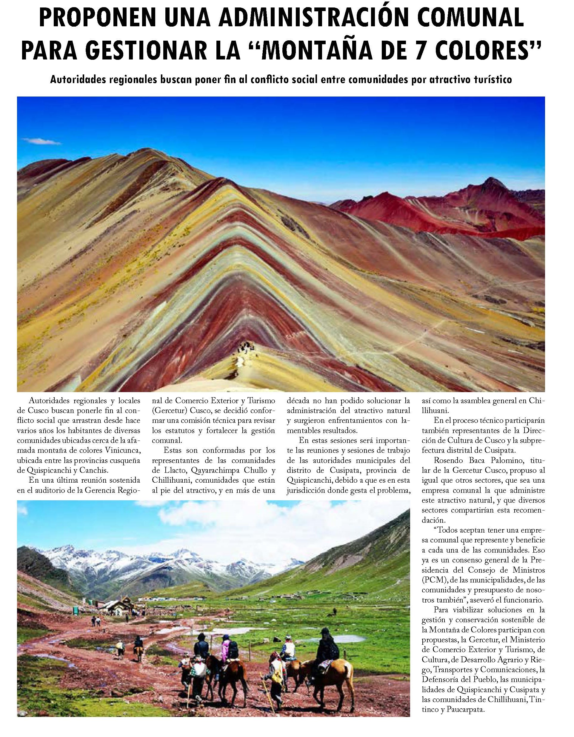 Autoridades regionales y locales de Cusco buscan ponerle fin al conflicto social que arrastran desde hace varios años los habitantes de diversas comunidades ubicadas cerca de la afamada montaña de colores Vinicunca, ubicada entre las provincias cusqueña de Quispicanchi y Canchis.