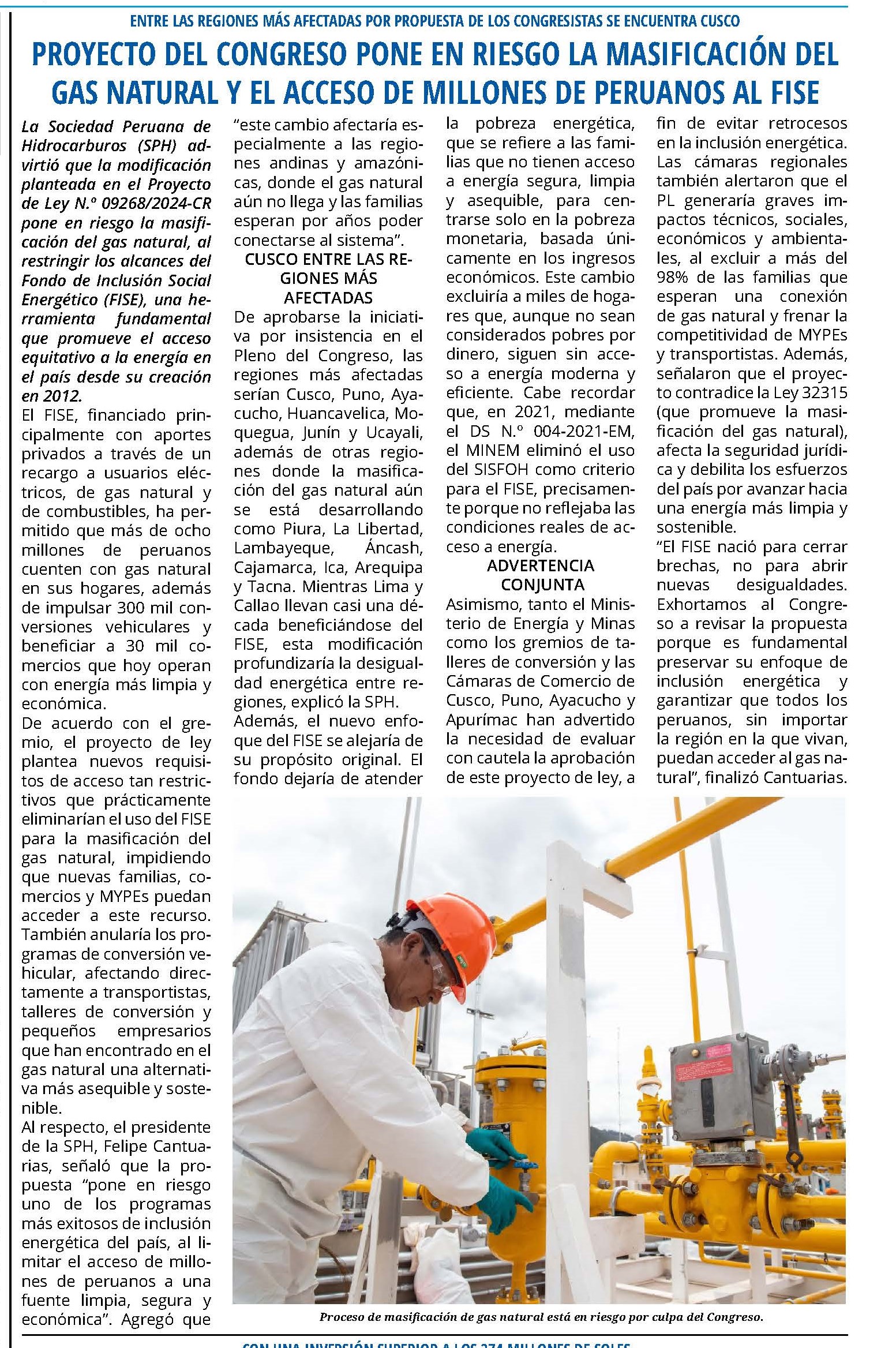 La Sociedad Peruana de Hidrocarburos (SPH) advirtió que la modificación plantea da en el Proyecto de Ley N.O 09268/2024-CR pone en riesgo la masificación del gas natural, al restringir los alcances del Fondo de Inclusión Social Energético (FISE), una herramienta fundamental que promueve el acceso equitativo a la energía en el país desde su creación en 2012.
