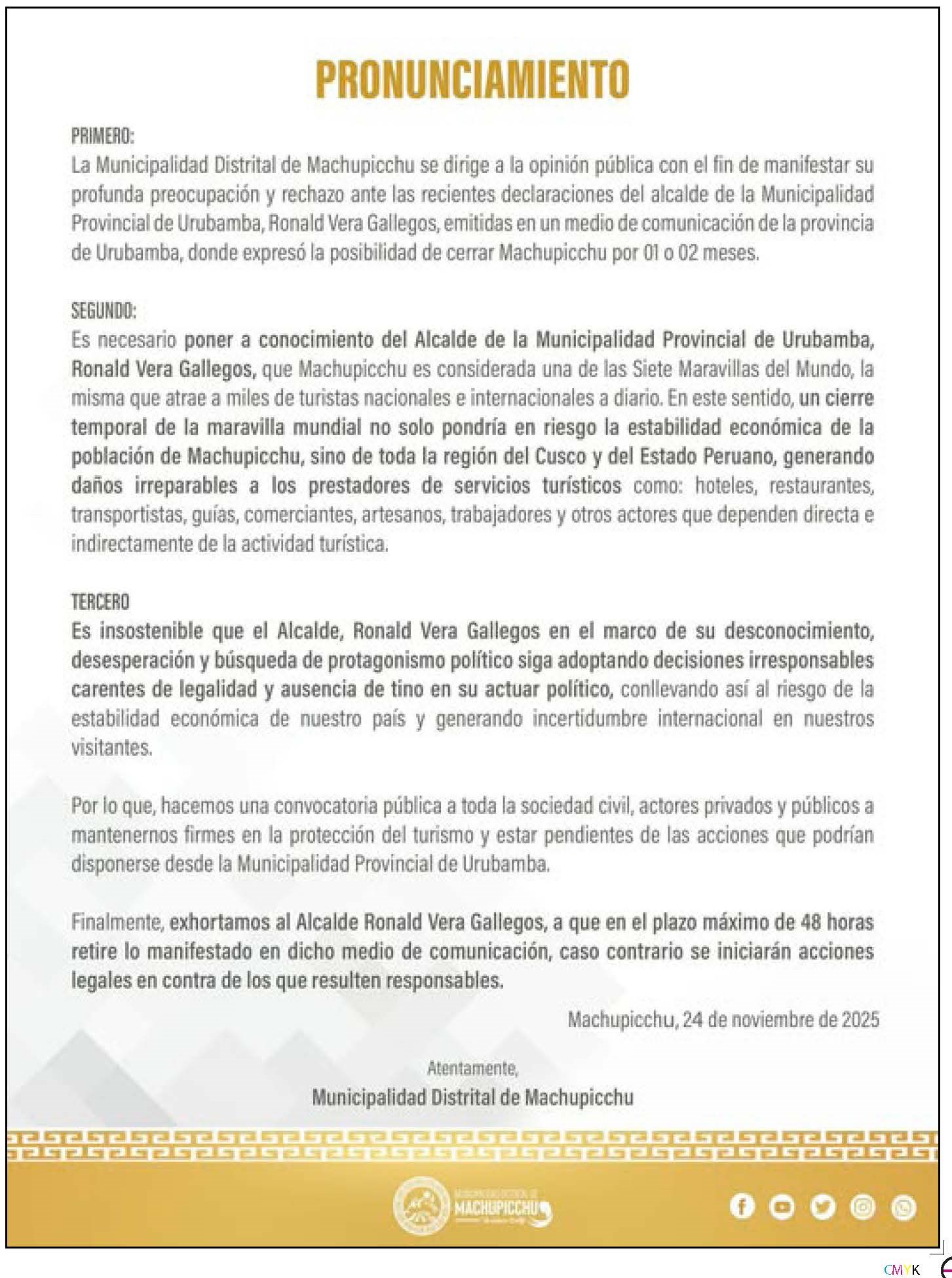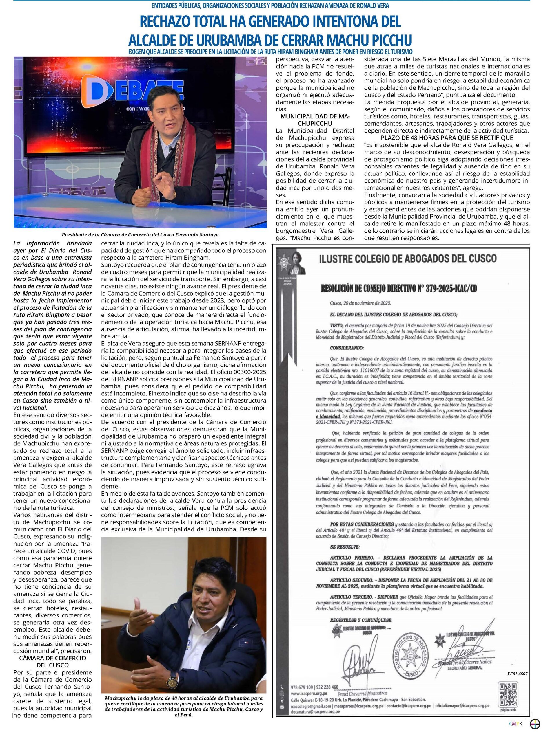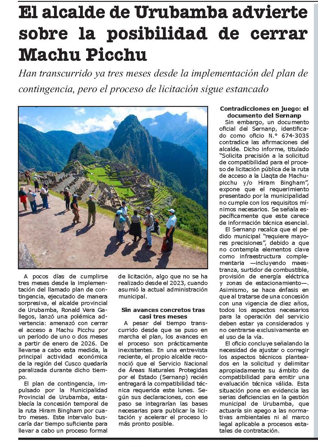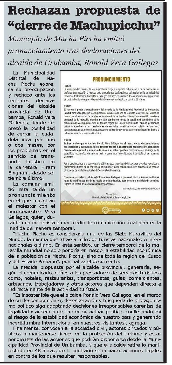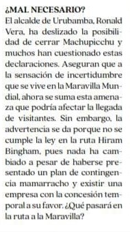 Las declaraciones del alcalde de Urubamba Ronald Vera de cerrar Machupicchu por dos meses ha encendido la alarma en todo el sector turístico, debido a que la medida no estaría sustentada en criterios de preservación del patrimonio, sino en la incapacidad de garantizar un adecuado servicio de transporte y de impulsar un proceso transparente de concesión