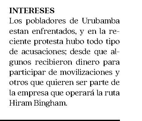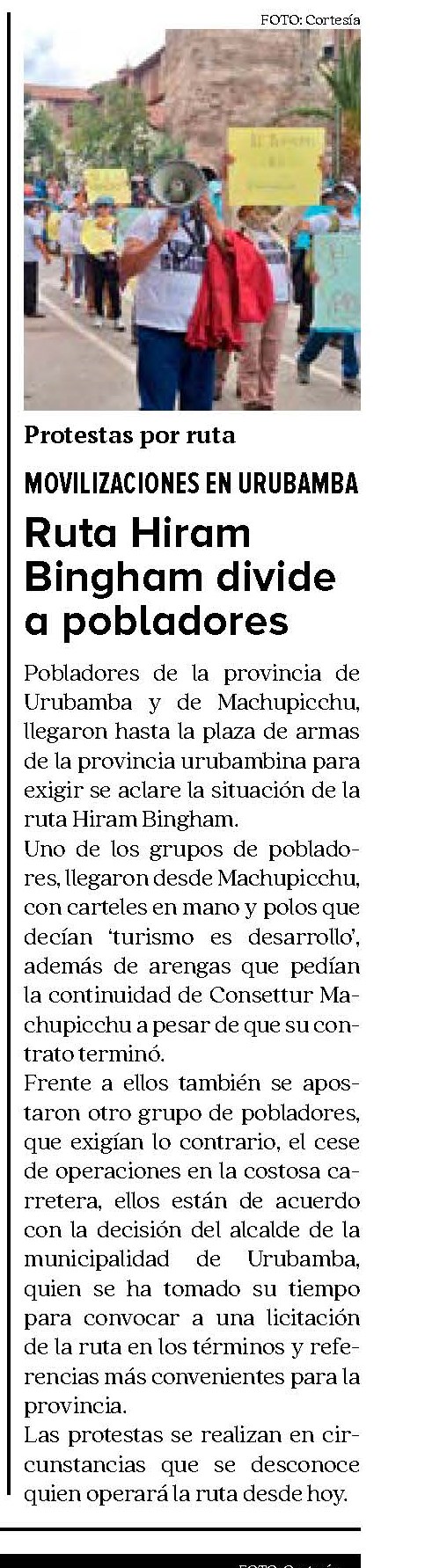 El alcalde de la Municipalidad de Machu Picchu se pronunció sobre el tema de Consettur. Pobladores de la provincia de Urubamba y de Machupicchu, llegaron hasta la plaza de armas de la provincia urubambina para exigir se aclare la situación de la ruta Hiram Bingham