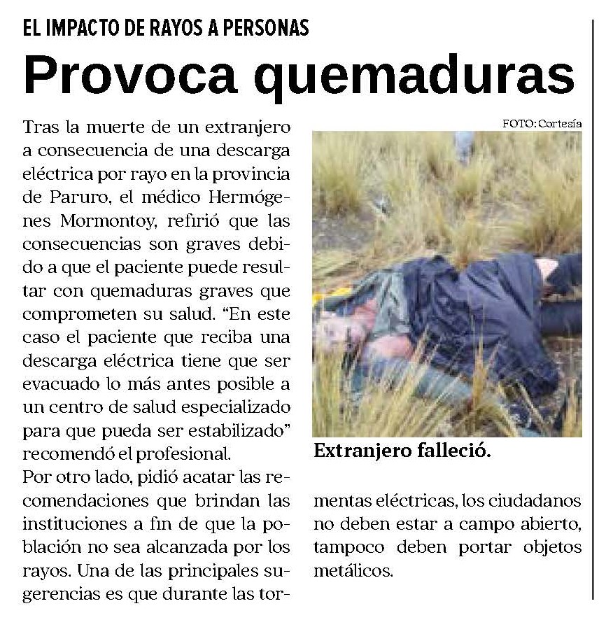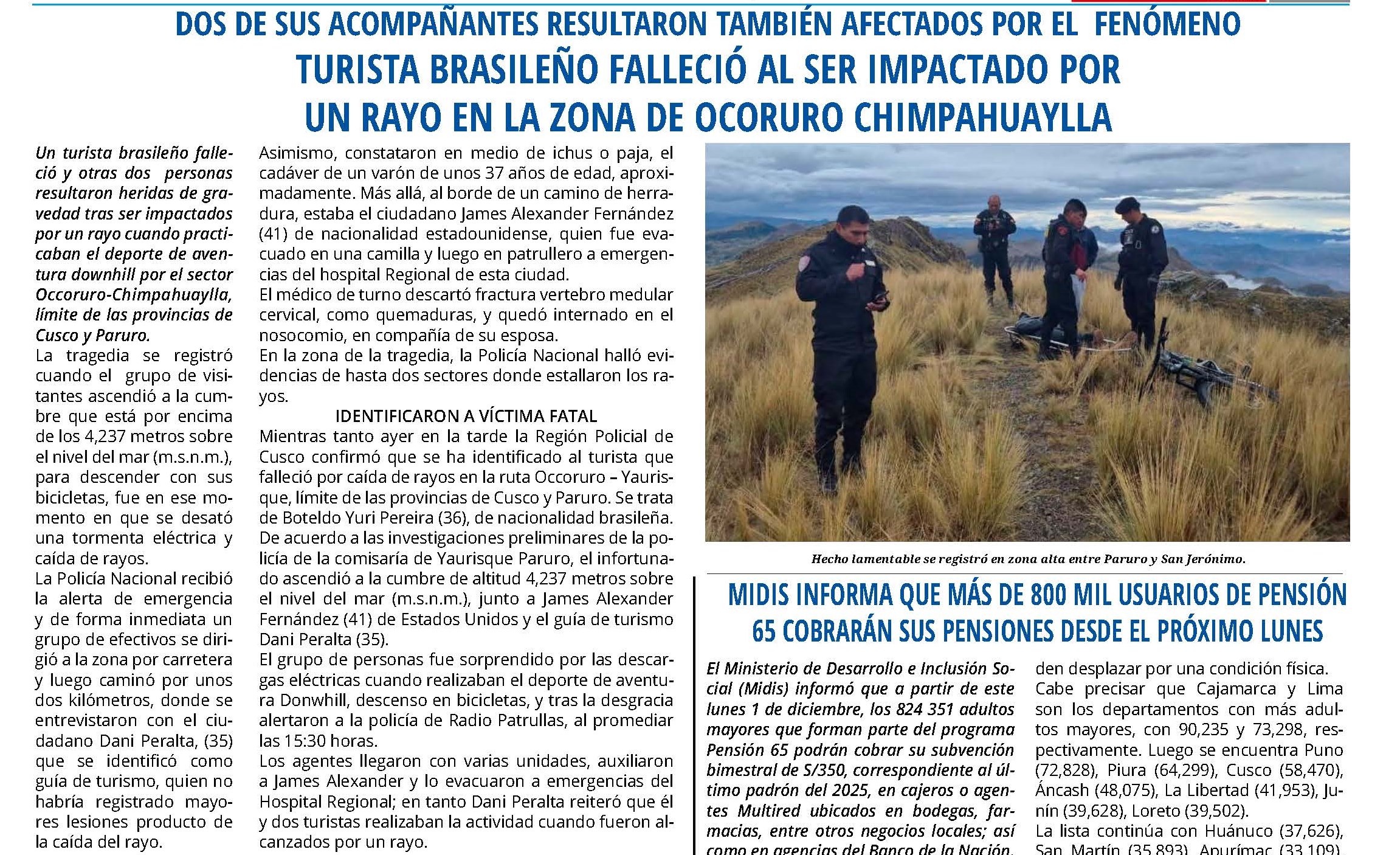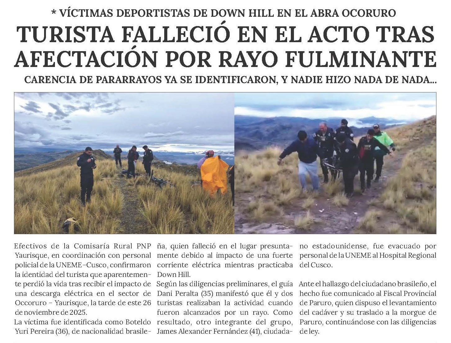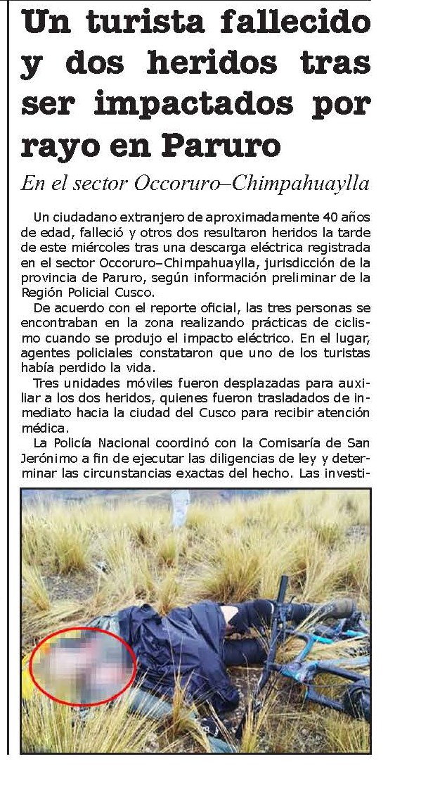 (…) Se trata de Boteldo Yuri Pereira (36), de nacionalidad brasileña. De acuerdo a las investigaciones preliminares de la policía de la comisaría de Yaurisque Paruro, el infortunado ascendió a la cumbre de altitud 4,237 metros sobre el nivel del mar (m.s.n.m.), junto a James Alexander Fernández (41) de Estados Unidos y el guía de turismo Dani Peralta (35).