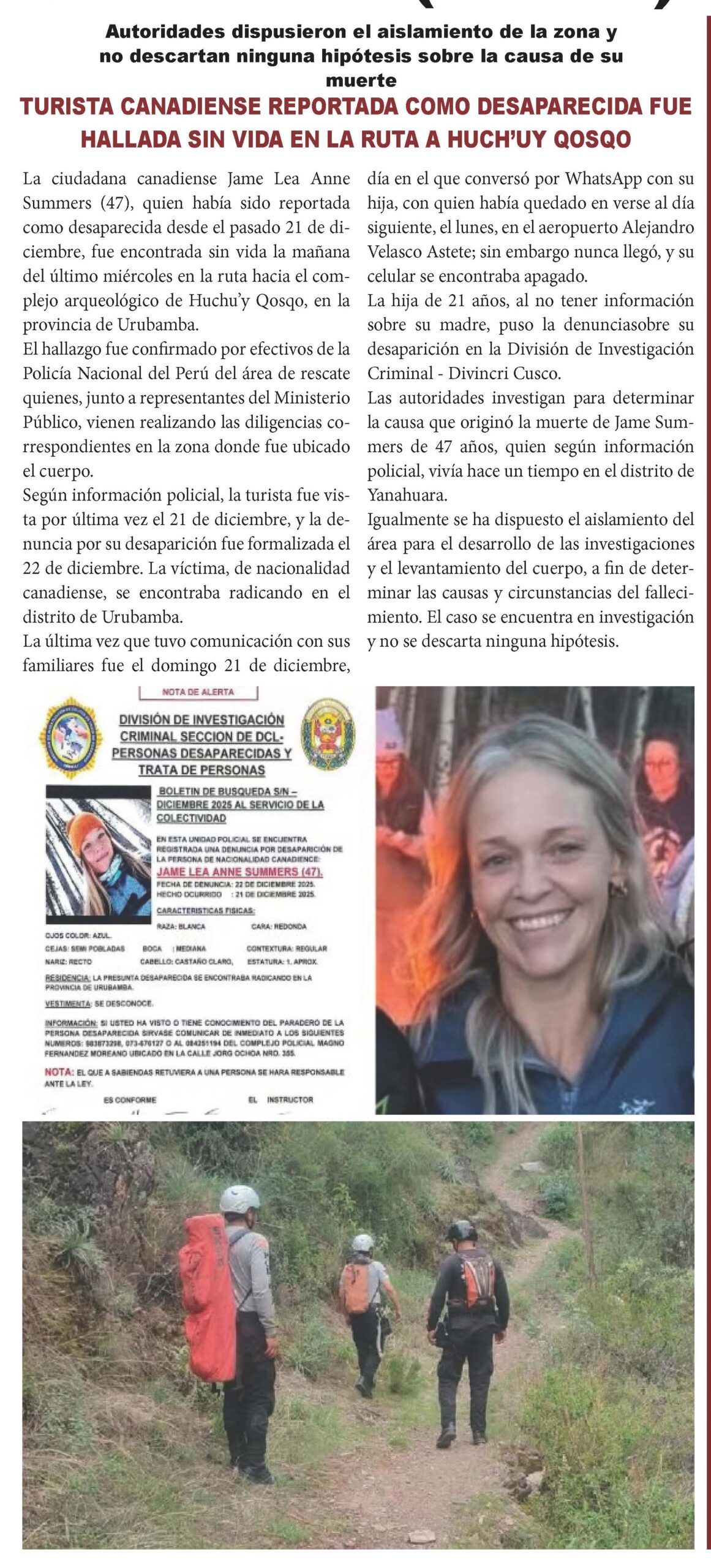 La ciudadana canadiense Jame Lea Anne Summers, de 47 años, fue hallada sin vida la mañana de este miércoles en la ruta que conduce al complejo arqueológico de Uchu Qosqo, en la provincia cuzqueña de Urubamba.