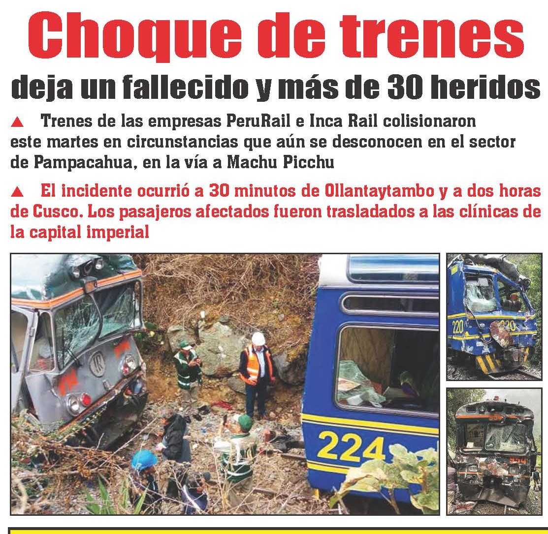 Un fallecido, identificado como Roberto Cardenas, así como 30 heridos, entre nacionales y extranjeros, es el saldo que ha dejado el choque frontal de dos trenes en el kilómetro 98, en el sector Pampacahua, en el tramo Machu Picchu – Ollantaytambo. Así lo confirmó la Policía Nacional. Los trenes que colisionaron pertenecen a las empresas PeruRail e IncaRail, según informaron desde Ferrocarril Trasandino, empresa concesionaria de la vía del tren suroriente del país. El choque se produjo cerca a la 1: 20 p. m.