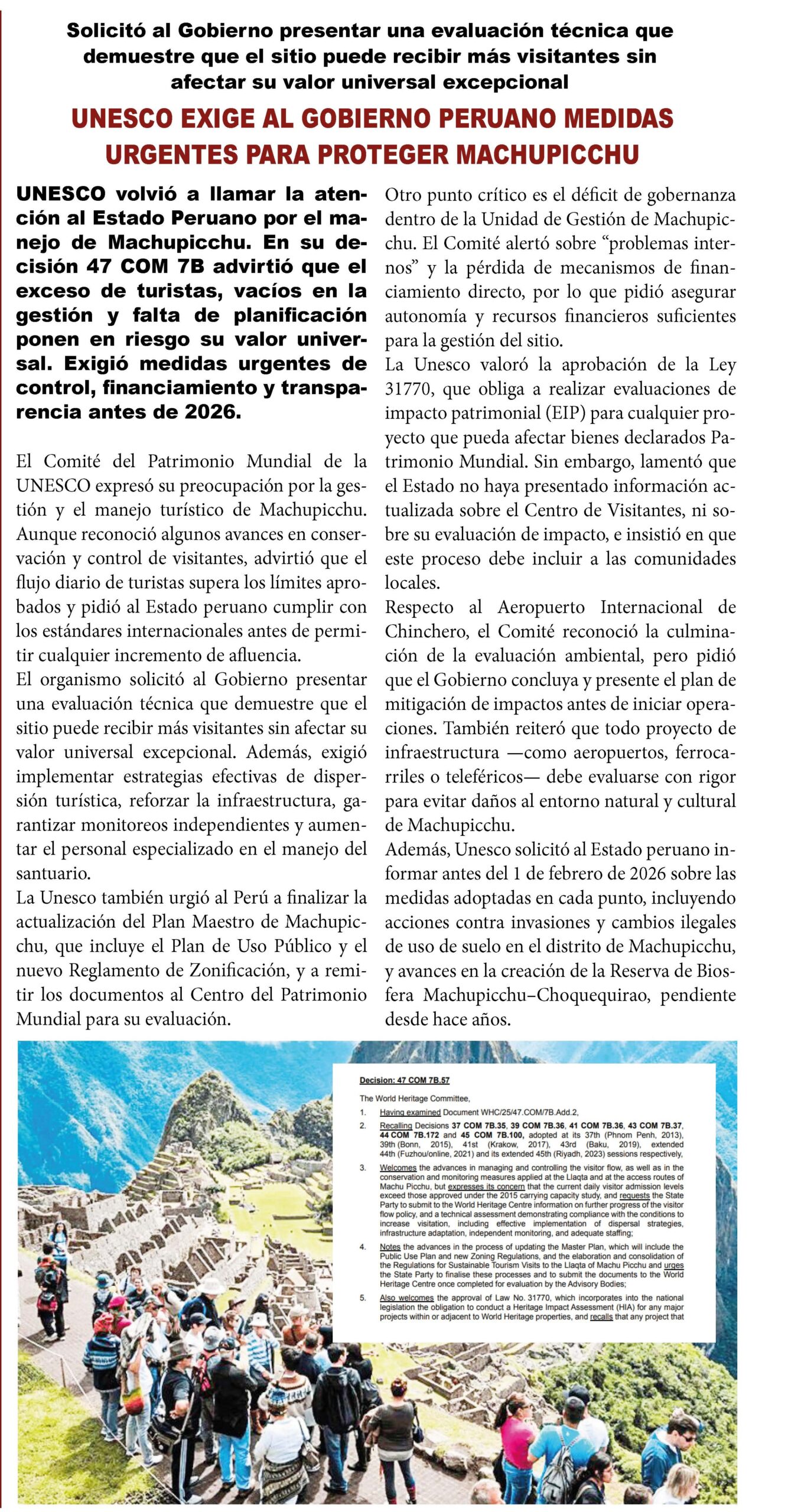 UNESCO volvió a llamar la atención al Estado Peruano por el manejo de Machupicchu. Advirtió que el exceso de turistas, vacíos en la gestión y falta de planificación ponen en riesgo su valor universal. Exigió medidas urgentes de control, financiamiento y transparencia antes de 2026.