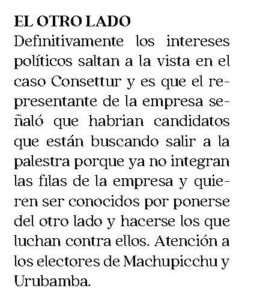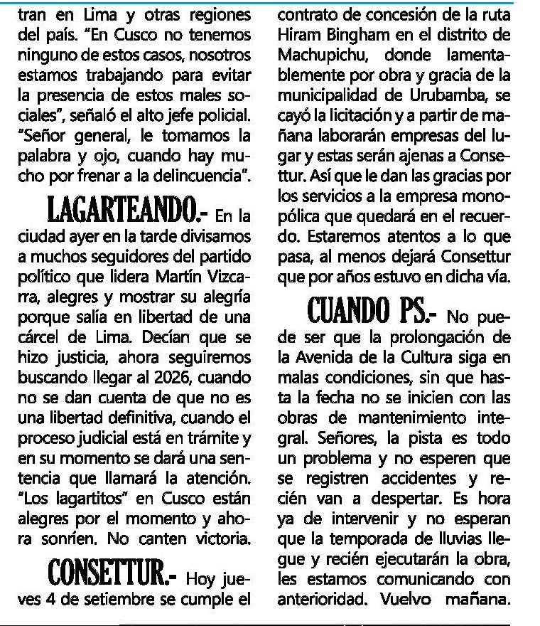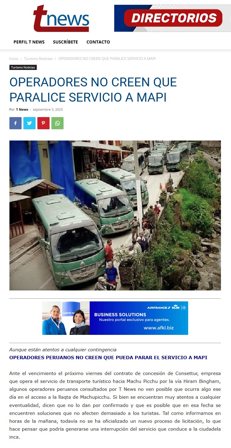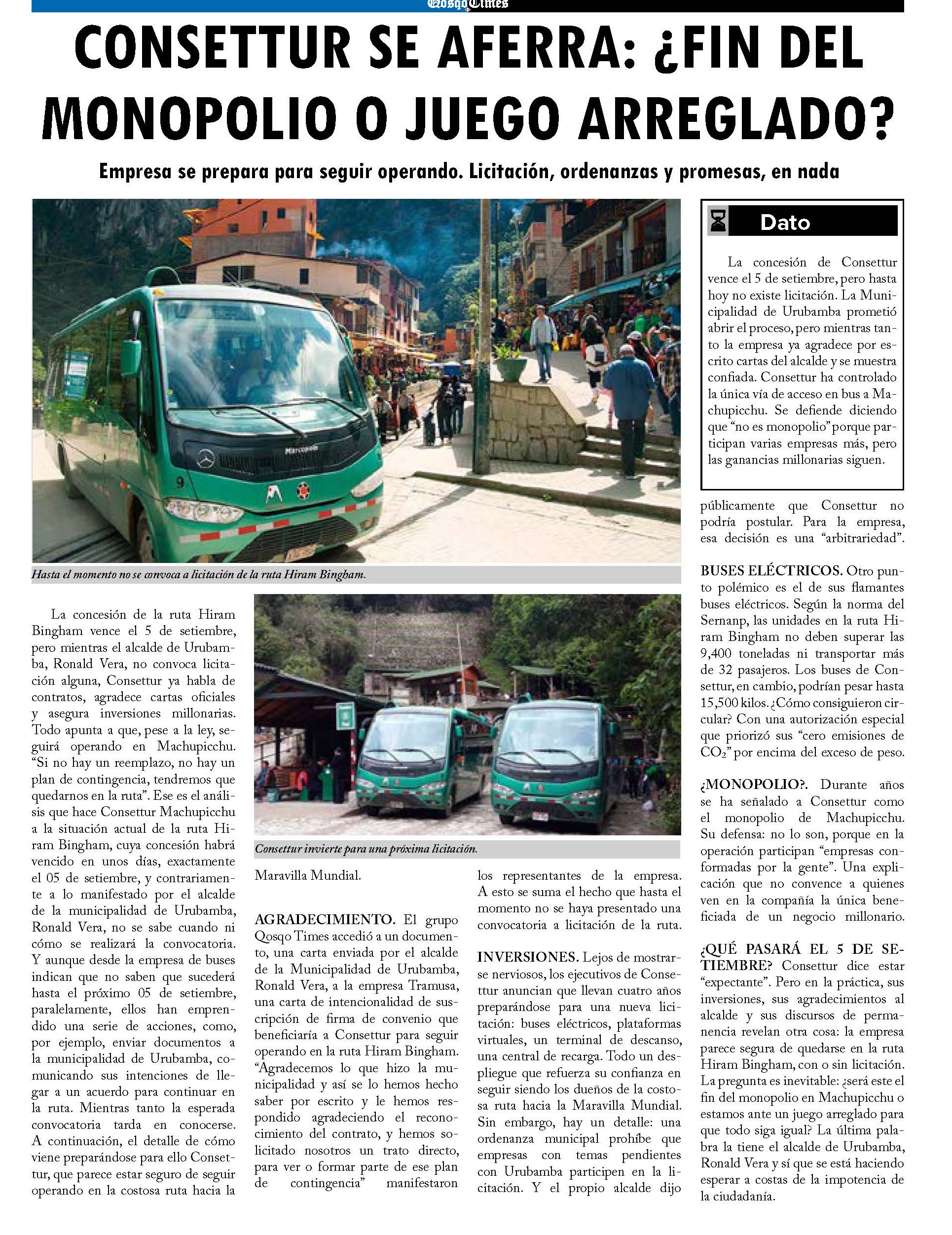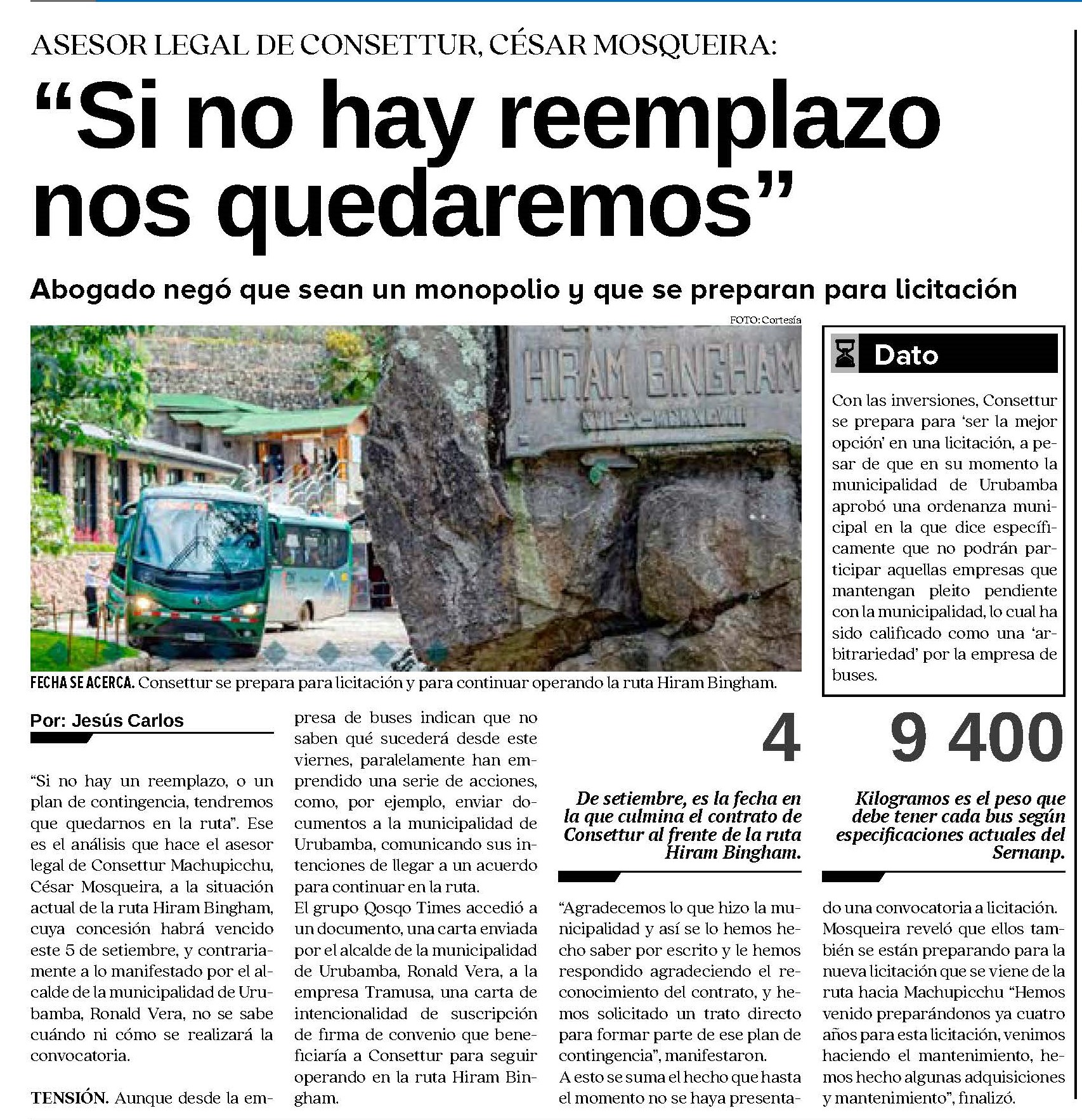 Consettur dejará de operar en la carretera Hiram BinghamEste jueves 5 de setiembre vence el contrato en el uso de la ruta Hiram Bingham que es administrada por la empresa Consettur, pero está claro que la empresa privada seguirá controlando la vía debido a que la Municipalidad Provincial de Urubamba no ha logrado realizar la nueva licitación