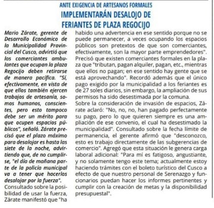 Sobre la consideración de invasión de espacios, Zárate aclaró: “No, no, no, han pagado perfectamente su pago, pero lo que quieren siempre es una ampliación de ese convenio, el cual ha desestimado la municipalidad;. Consultado sobre la fecha límite de permanencia, el gerente afirmó que desconozco, esto es trabajo directamente de las subgerencias de comercio. Agregó que esta situación le genera carga laboral adicional: Para mí es fatigoso, angustiante, y no solamente tengo este tema; actualmente estoy haciendo trámites con el boleto turístico del Cusco a efecto de que nuestro personal de Serenazgo y funcionarios puedan hacer los informes pertinentes y cumplir con la creación de metas y la disponibilidad presupuestal