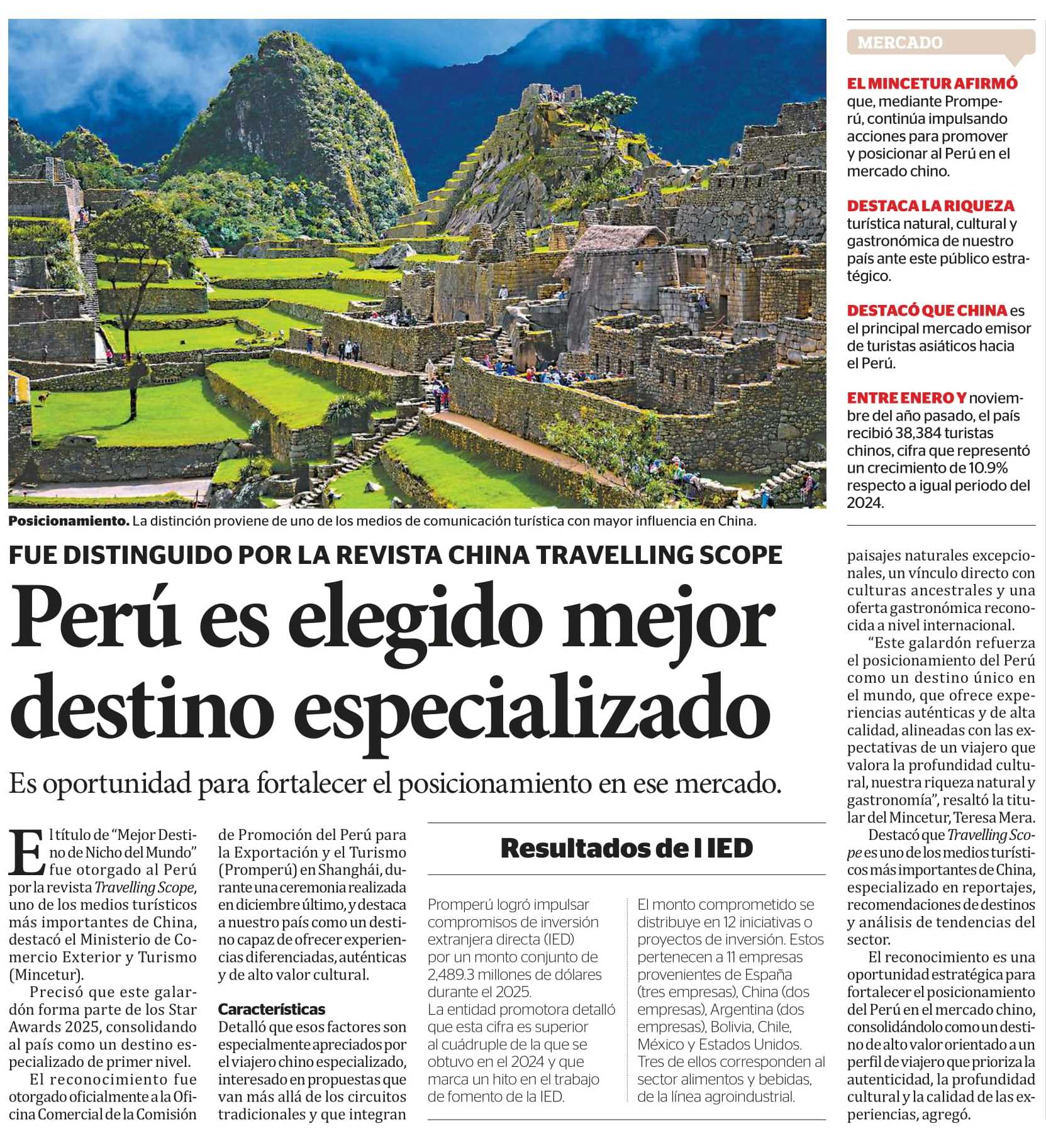 (…) El reconocimiento fue otorgado oficialmente a la Oficina Comercial de la Comisión de Promoción del Perú para la Exportación y el Turismo (Promperú) en Shanghái, durante una ceremonia realizada en diciembre último, y destaca a nuestro país como un destino capaz de ofrecer experiencias diferenciadas, auténticas y de alto valor cultural