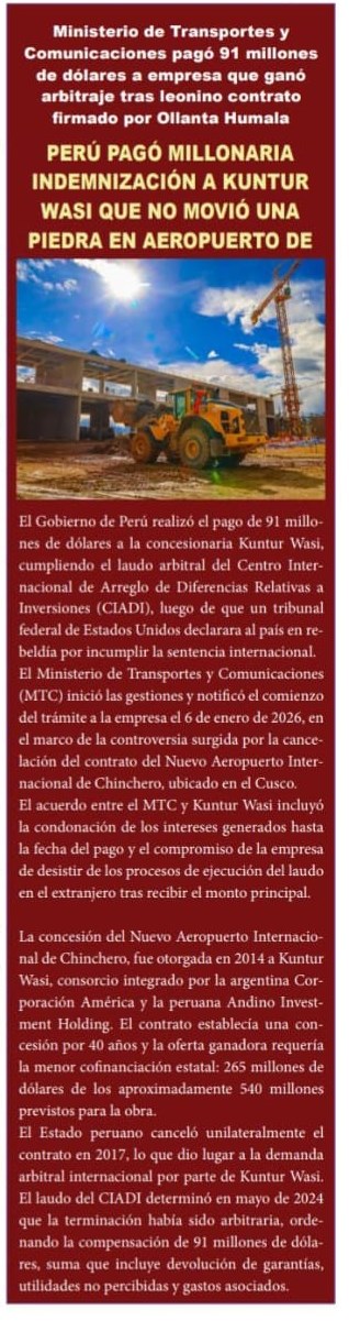El Gobierno de Perú realizó el pago de 91 millones de dólares a la concesionaria Kuntur Wasi, cumpliendo el laudo arbitral del Centro Inter nacional de Arreglo de Diferencias Relativas a Inversiones (CIADI), luego de que un tribunal federal de Estados Unidos declarara al país en rebeldía por incumplir la sentencia internacional. El Ministerio de Transportes y Comunicaciones (MTC) inició las gestiones y notificó el comienzo del trámite a la empresa el 6 de enero de 2026, en el marco de la controversia surgida por la cancelación del contrato del Nuevo Aeropuerto Inter nacional de Chinchero, ubicado en el Cusco.